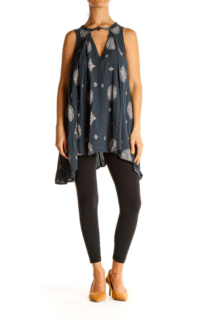 Front view of Free People navy tunic with white medallion print and keyhole neckline