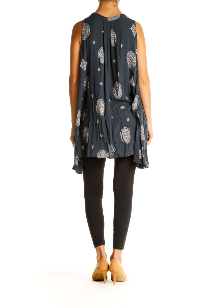 Elevate your casual wardrobe with this stunning navy sleeveless tunic from Free People. The flowy silhouette features an eye-catching print of white circular medallions and delicate star-like patterns, creating a bohemian-inspired look that's perfect for any laid-back occasion. The lightweight fabric drapes beautifully, offering both comfort and style.