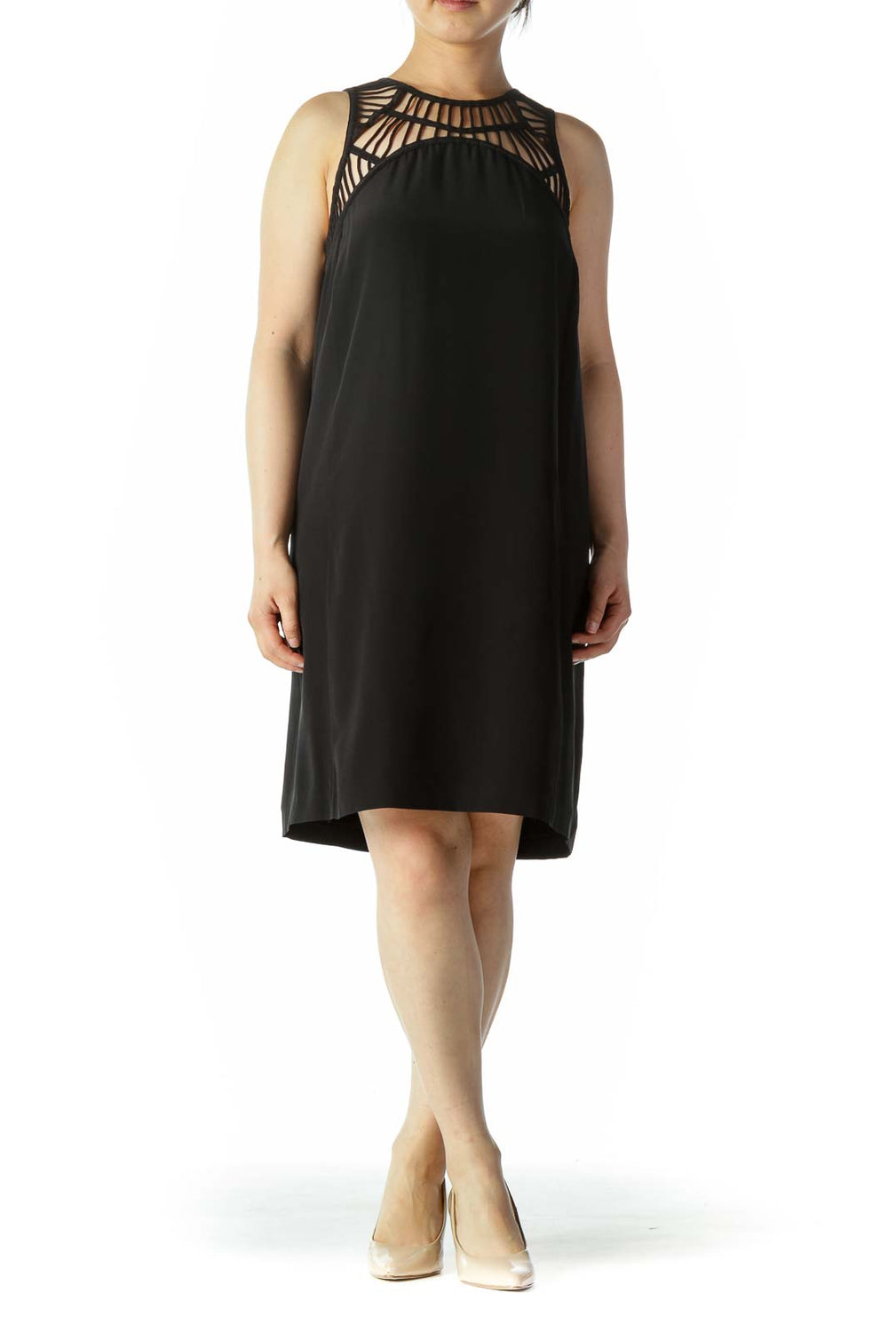 Make a stunning entrance in this elegant black cocktail dress by Hoss. The sleek, sleeveless silhouette is elevated by an intricate cutout neckline, featuring a web-like pattern that adds a touch of allure and sophistication. The dress flows gracefully from the fitted bodice to a relaxed, straight skirt, hitting just above the knee for a flattering midi length.