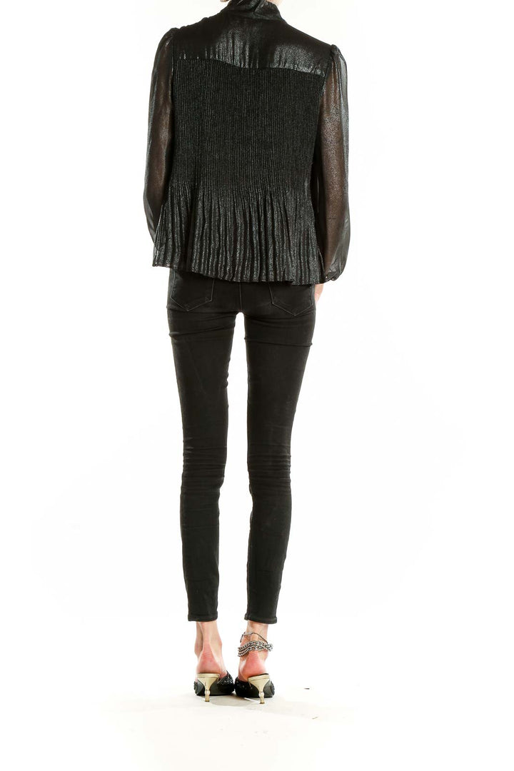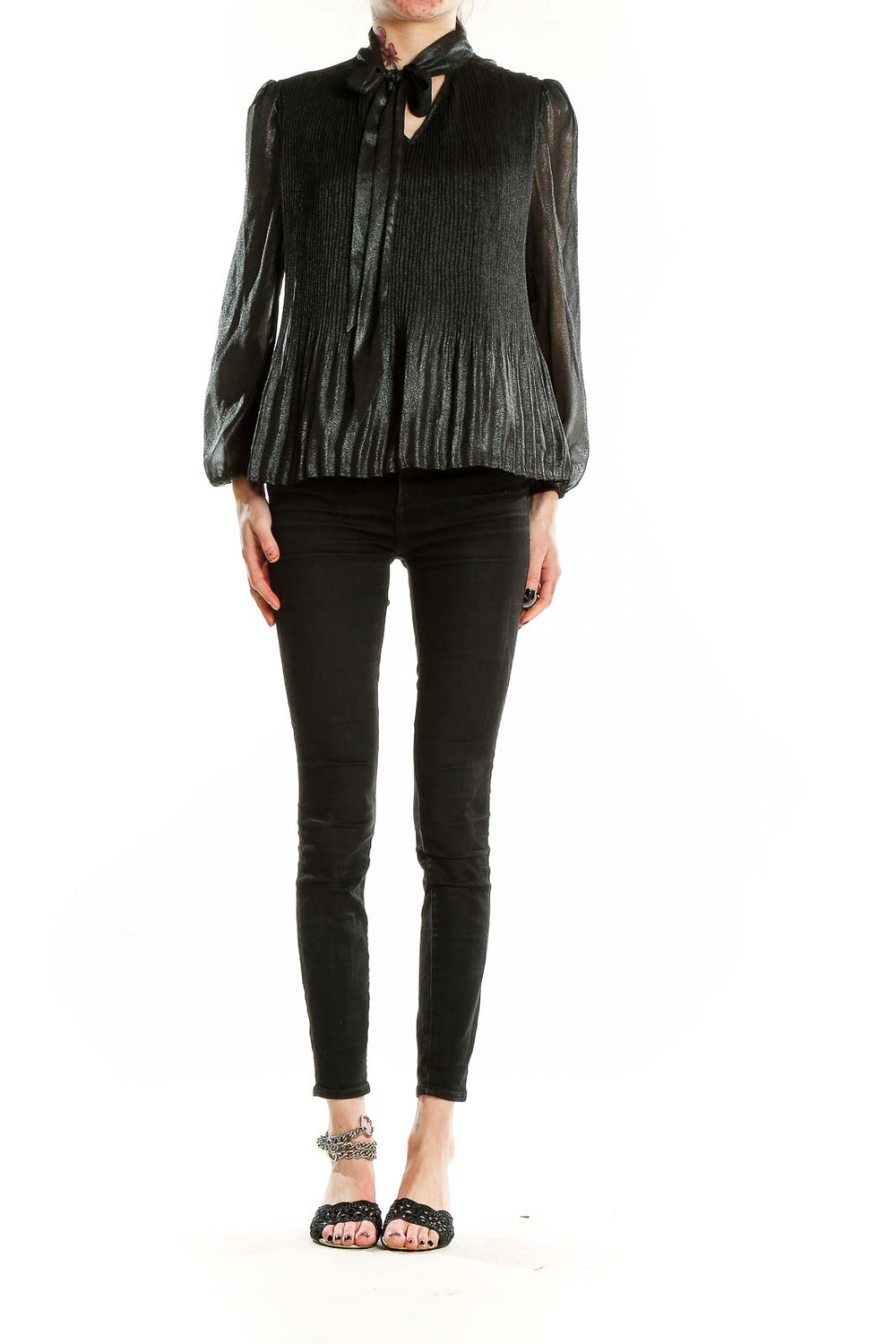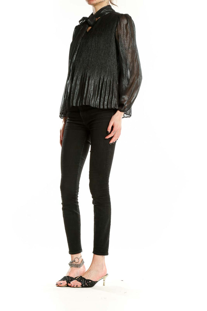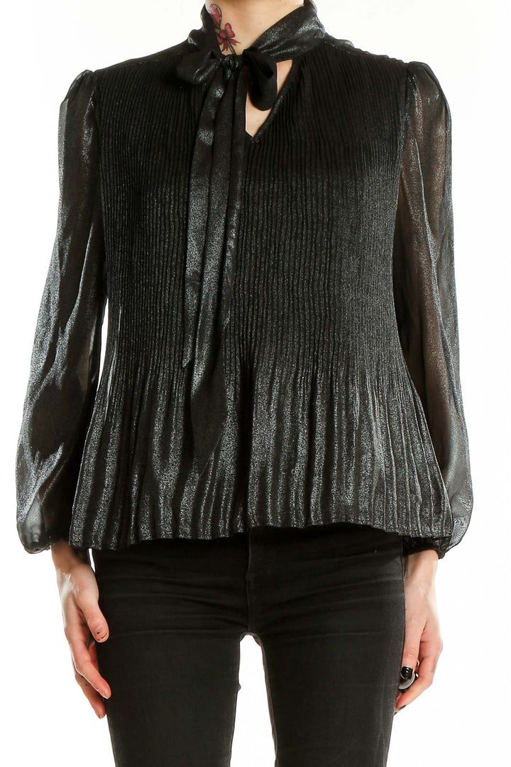 Elevate your evening ensemble with this stunning black shimmering blouse from Nanette Nanette Lepore. Crafted from luxurious polyester, this top features an eye-catching pleated design that cascades elegantly from the neckline to the hem. The tie-neck detail adds a touch of sophistication, while the long, sheer sleeves create a graceful silhouette.