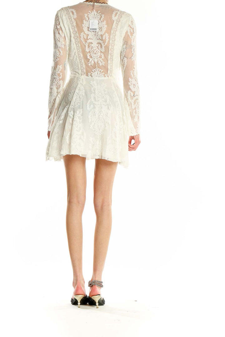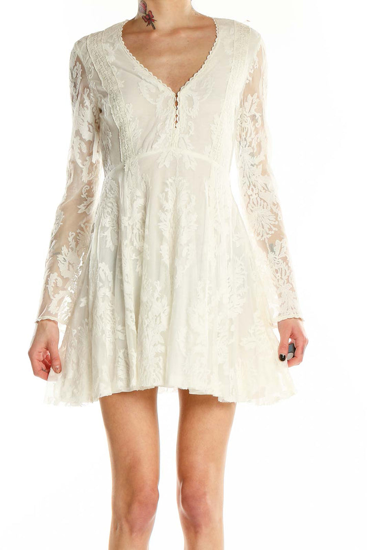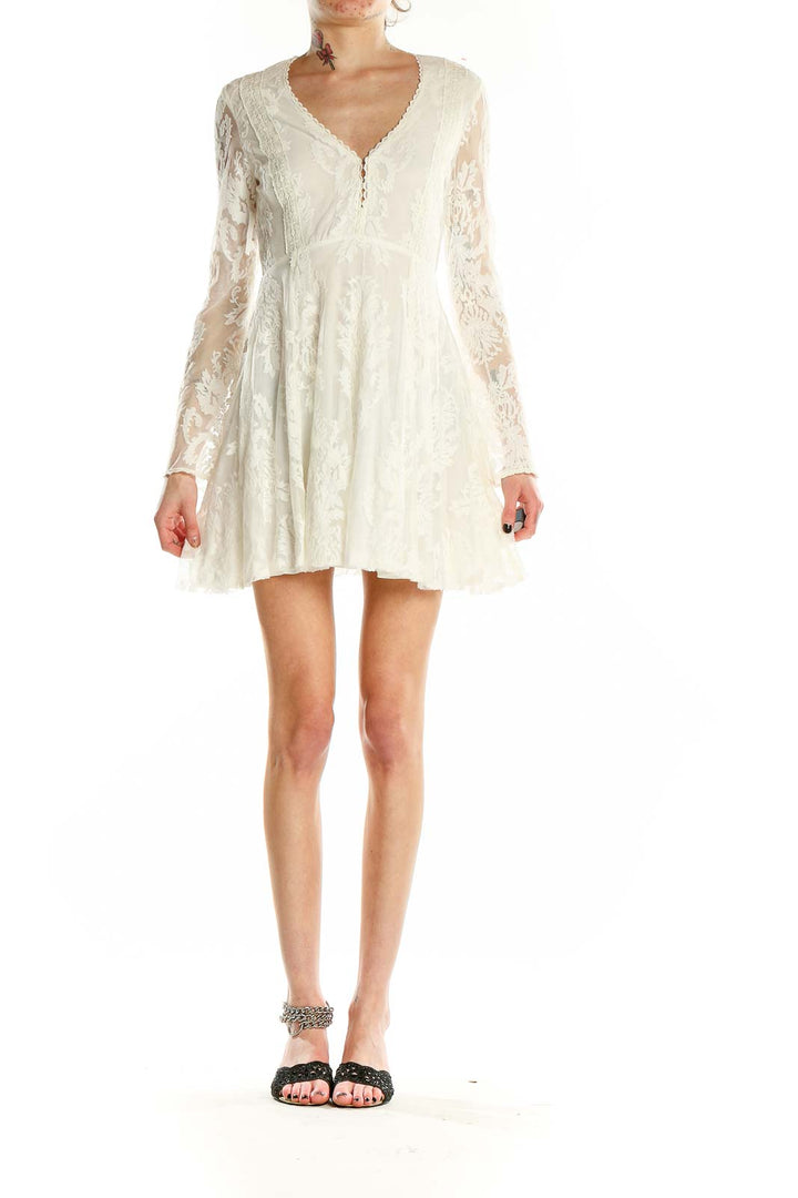 Elevate your style with this enchanting white lace mini dress from Free People. Crafted from delicate nylon, this dress features an intricate floral lace pattern that exudes romantic charm. The V-neckline with button details adds a touch of allure, while the long sheer sleeves provide elegant coverage. The dress's fitted empire waist flows into a flirty, flared skirt, creating a flattering silhouette that's perfect for various occasions. With its scalloped hem and ethereal design, this dress embodies the free-spirited essence of the Free People brand. New with tags, this size Small piece measures 34" in the bust, 26" in the waist, and 36" in the hips, with a playful 25" length that hits mid-thigh. Whether you're attending a garden party or a casual wedding, this dreamy lace dress is sure to make you stand out.
