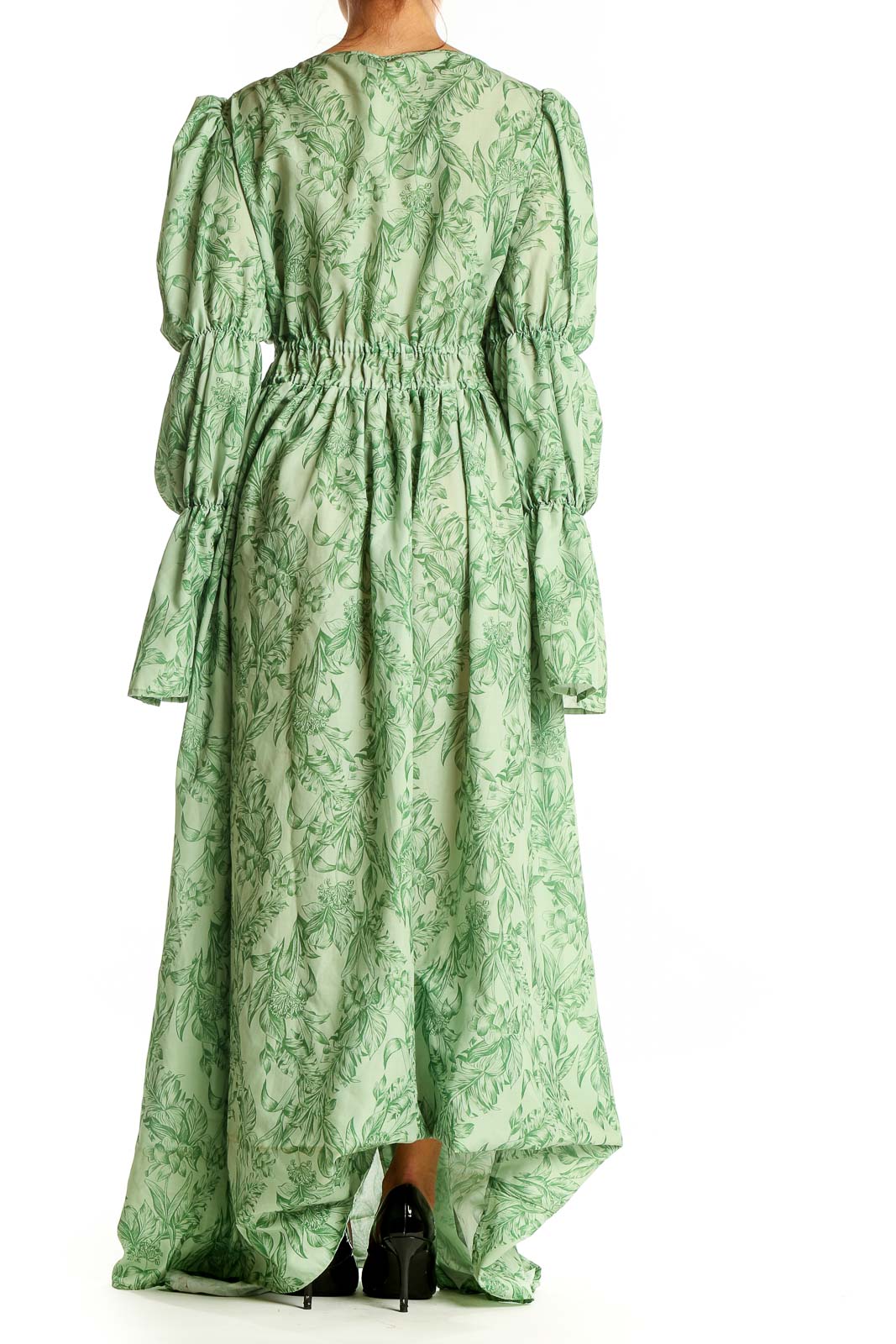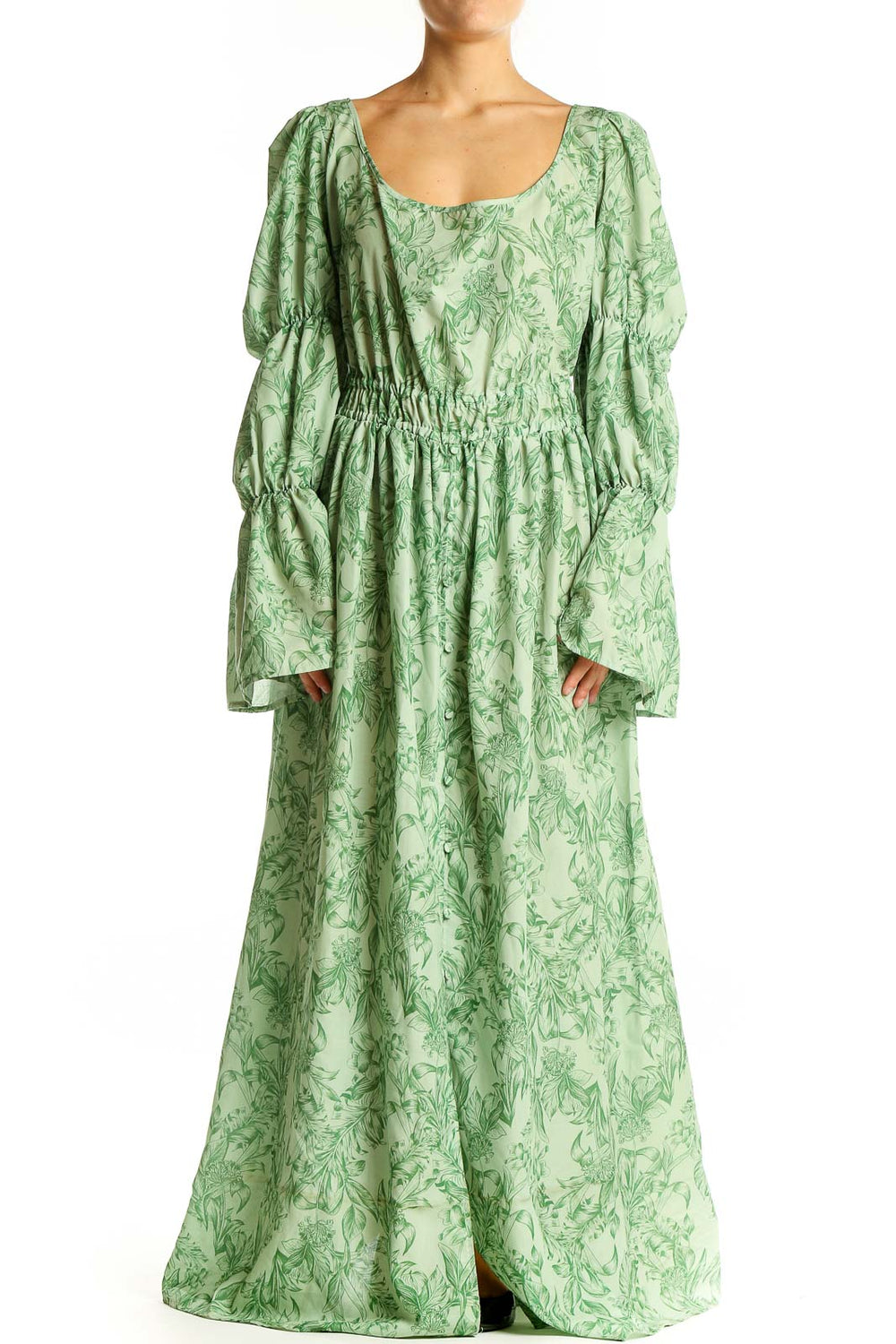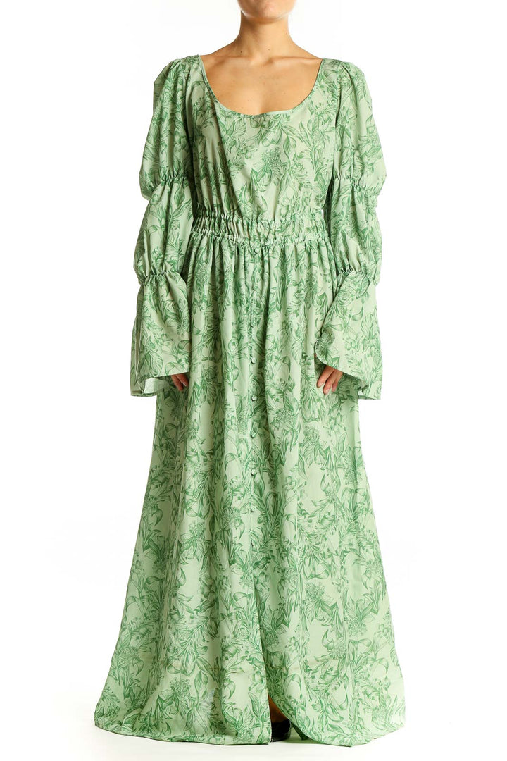 Make a statement in this enchanting green floral maxi dress from Eloquii. The light green background is adorned with a delicate darker green floral pattern, creating a romantic and feminine look perfect for any special occasion. The dress features a flattering scoop neckline and dramatic puff sleeves that gather at the elbow and wrist, adding a touch of whimsy to the silhouette. The empire waistline cinches in just below the bust, flowing into a full-length skirt that gracefully skims the floor. Crafted from a comfortable blend of polyester, rayon, and spandex, this dress offers both elegance and ease of wear. The good condition of this plus-size beauty ensures you'll turn heads at your next event. With its generous measurements and flowing design, this dress is ideal for those seeking both style and comfort in sizes 3X and above.
