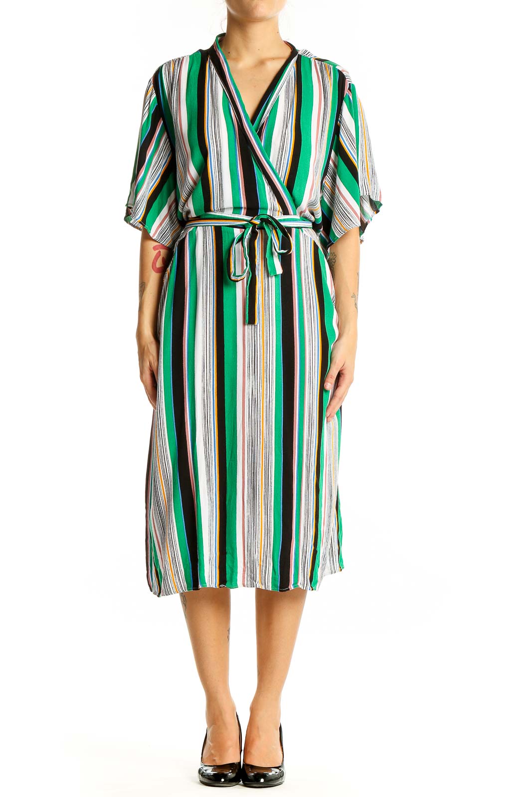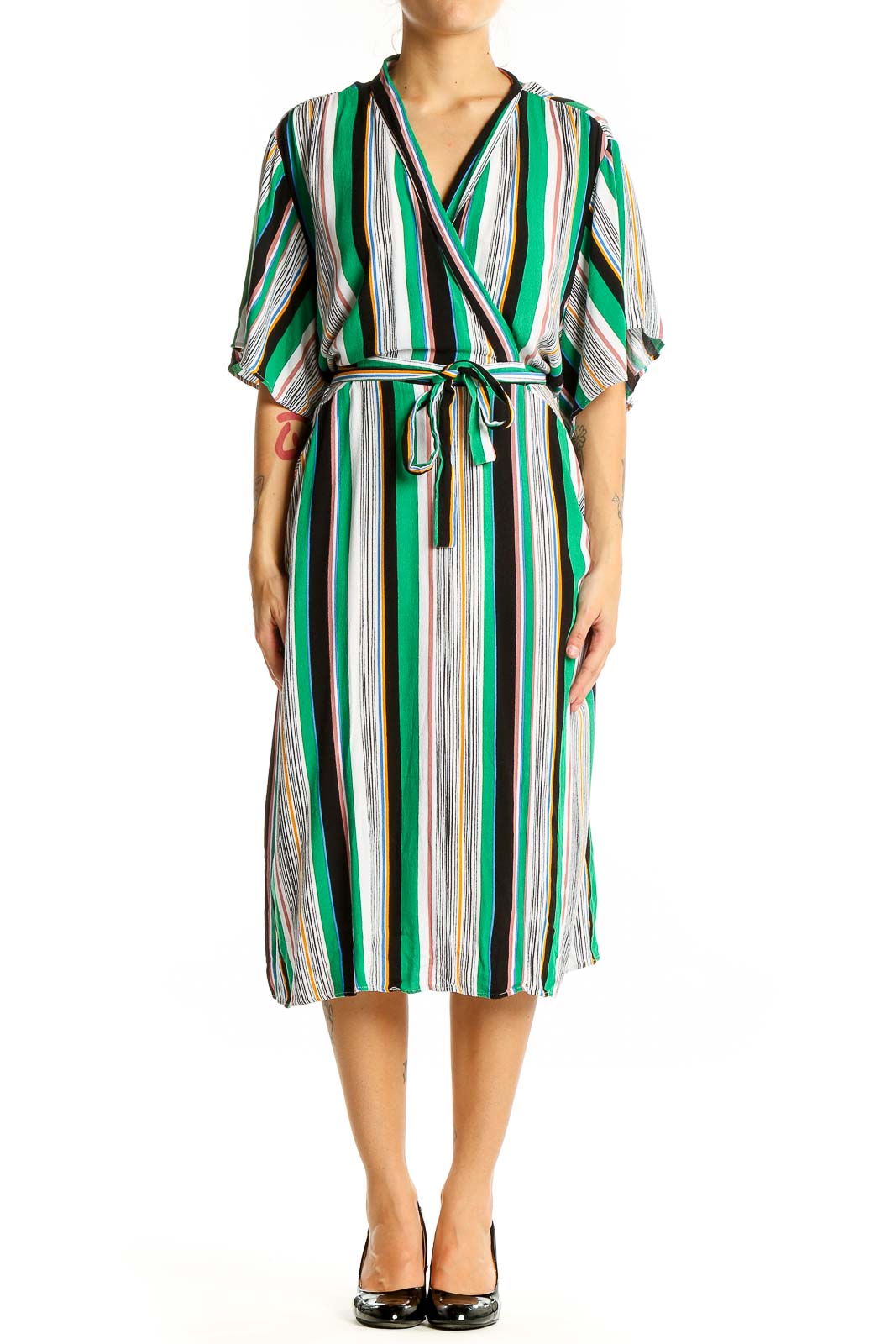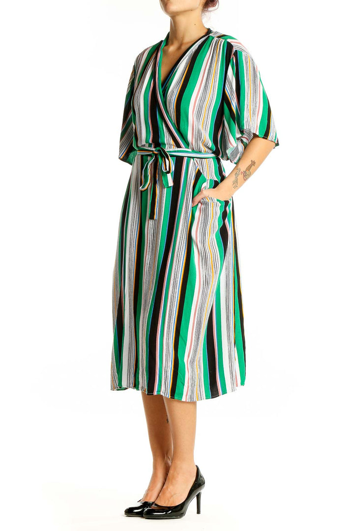 Make a statement in this eye-catching green striped wrap midi dress from Eloquii. The vibrant vertical stripes in shades of green, white, and black create a slimming effect while adding a pop of color to your wardrobe. Crafted from soft and flowy rayon, this dress offers both comfort and style for all-day wear.