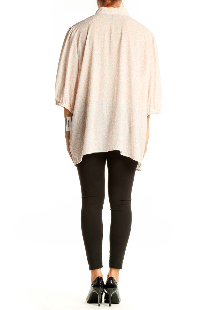 The delicate polka dot pattern in white against the blush background creates a feminine and playful aesthetic, perfect for both office wear and casual outings. The generous cut ensures comfort and ease of movement, while the longer length provides excellent coverage. In excellent condition, this Eloquii blouse is a versatile piece that can be dressed up or down for various occasions.