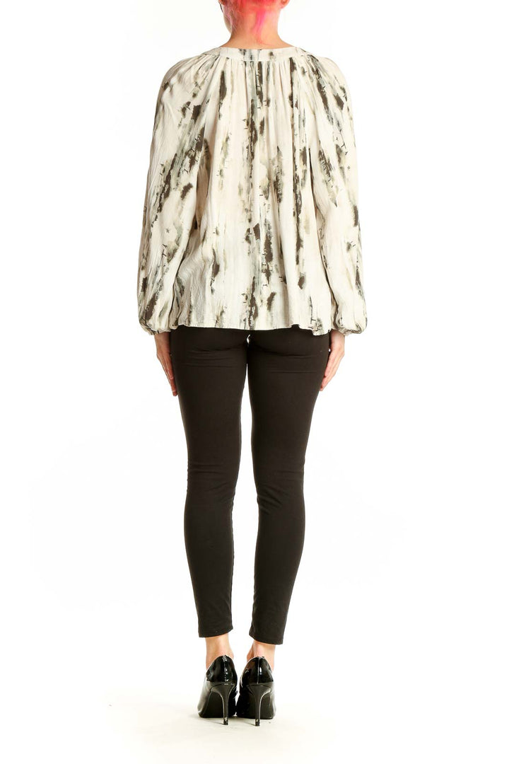 Elevate your casual wardrobe with this ethereal cream peasant blouse by Carly Jeans. The lightweight fabric features an intriguing abstract print in muted earth tones, creating a versatile piece that effortlessly transitions from day to night. The relaxed silhouette is accentuated by billowy long sleeves and a gathered neckline with delicate tie closures, offering both comfort and style.