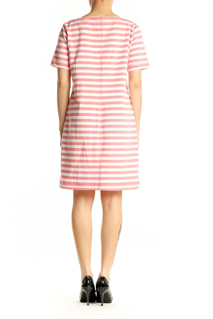 The dress features a flattering straight silhouette that falls just above the knee, suitable for various body types. Its soft cotton fabric ensures breathability, while the touch of spandex provides just the right amount of stretch for all-day comfort. The vibrant pink and white stripes create a fresh, playful look that's ideal for weekend brunches, beach walks, or running errands in style.