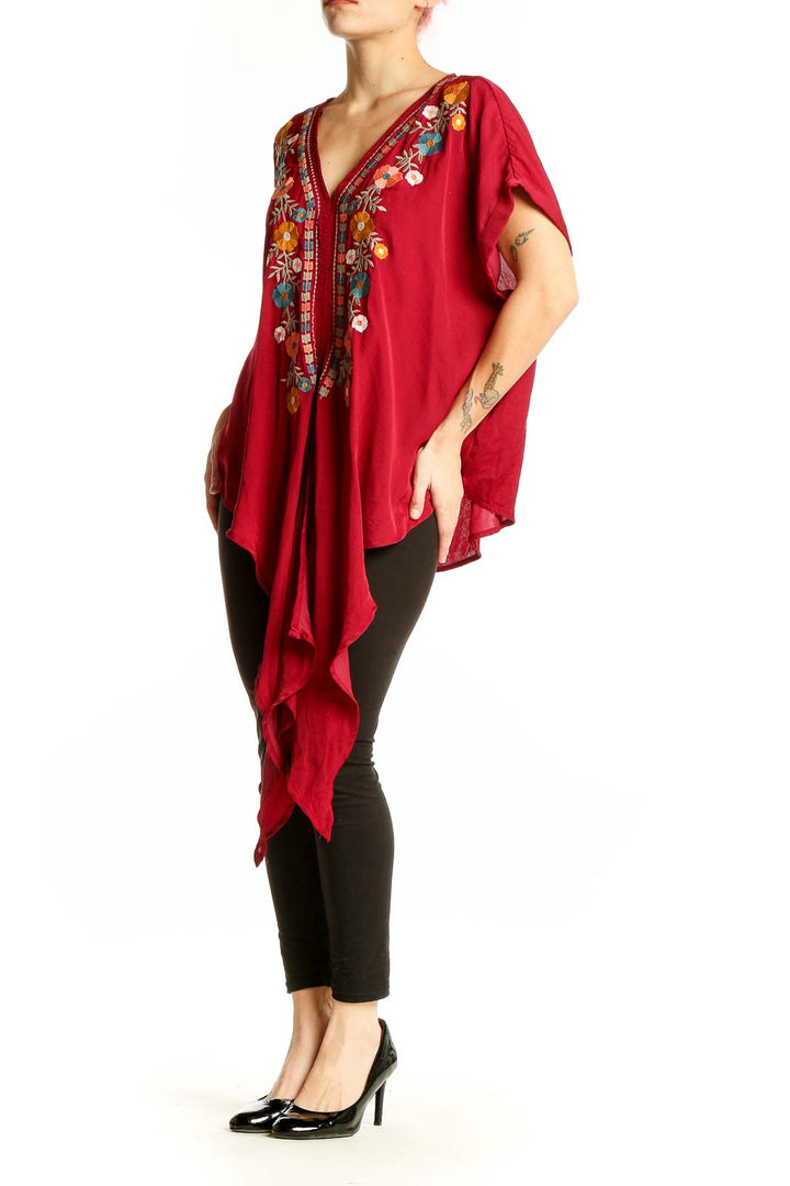 Make a statement with this stunning red tunic top from Entro. Featuring exquisite floral embroidery in vibrant hues of orange, pink, and blue, this piece is a true work of art. The V-neckline and rolled short sleeves add a casual yet chic touch, perfect for various occasions.