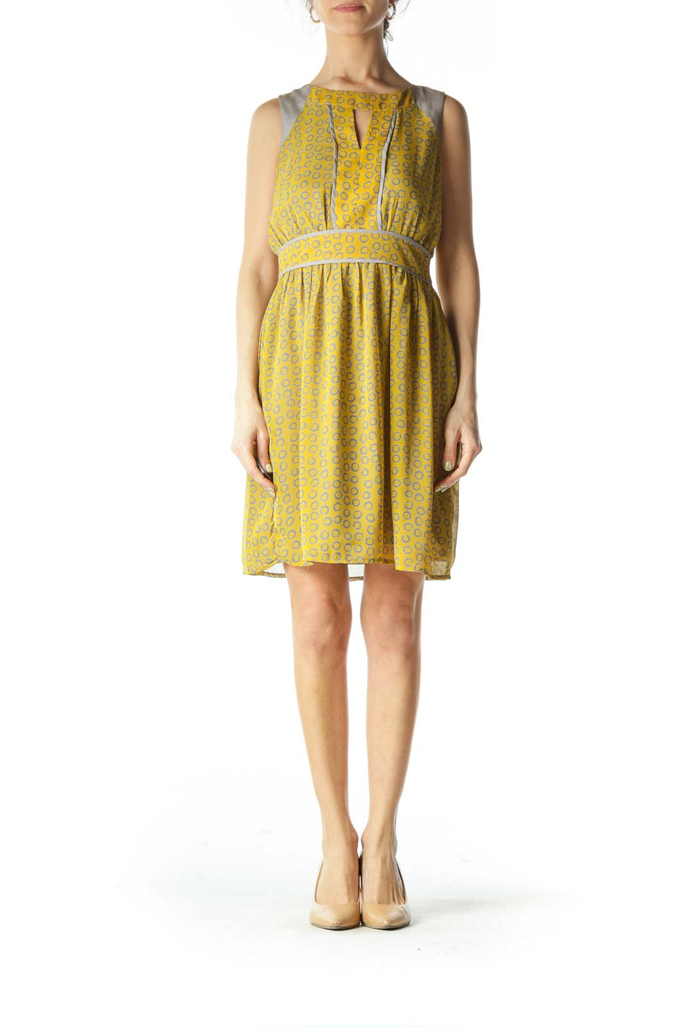 Gray and Yellow Circle-Patterned Peep-Hole Day Dress