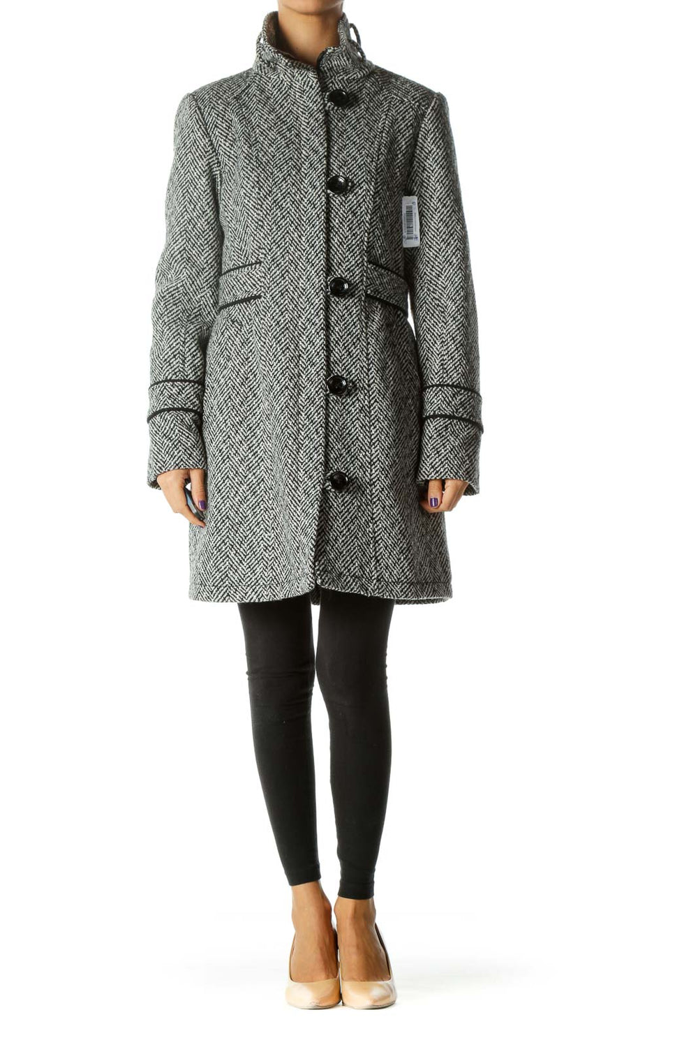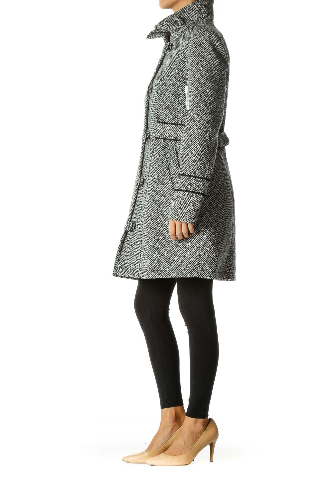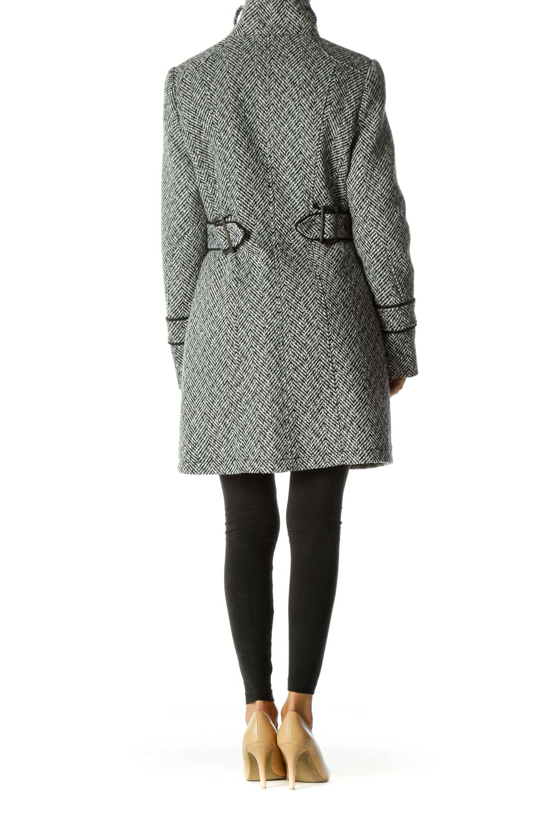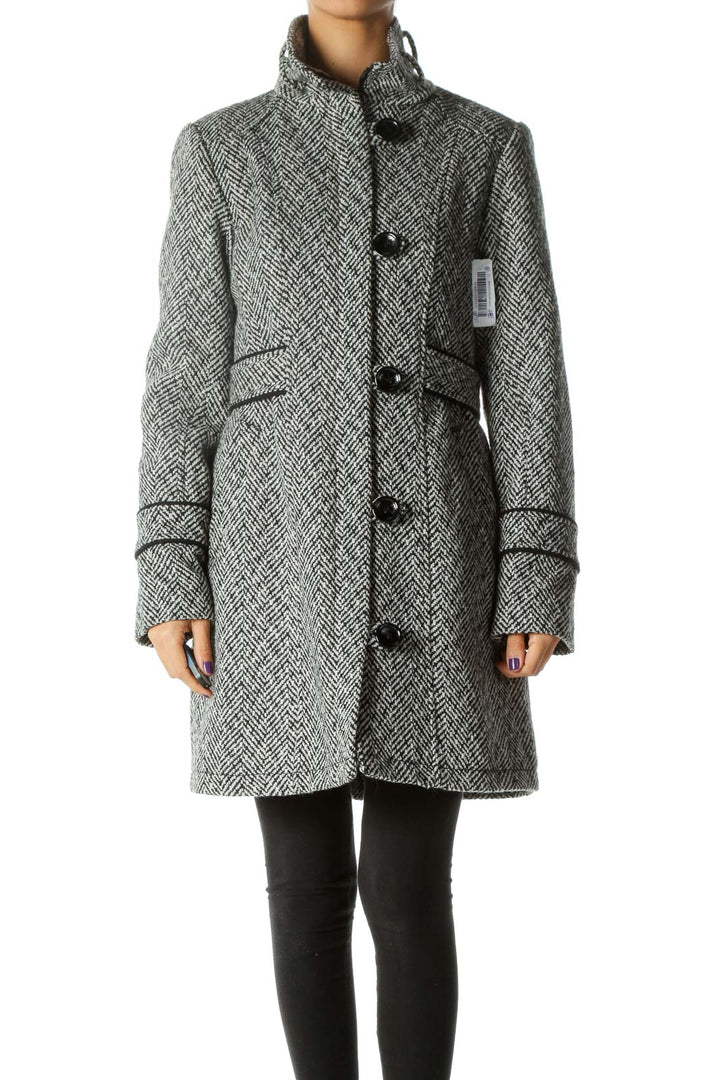 Black White Knit High Neck Zippered Buttoned Padded Shoulders Coat
