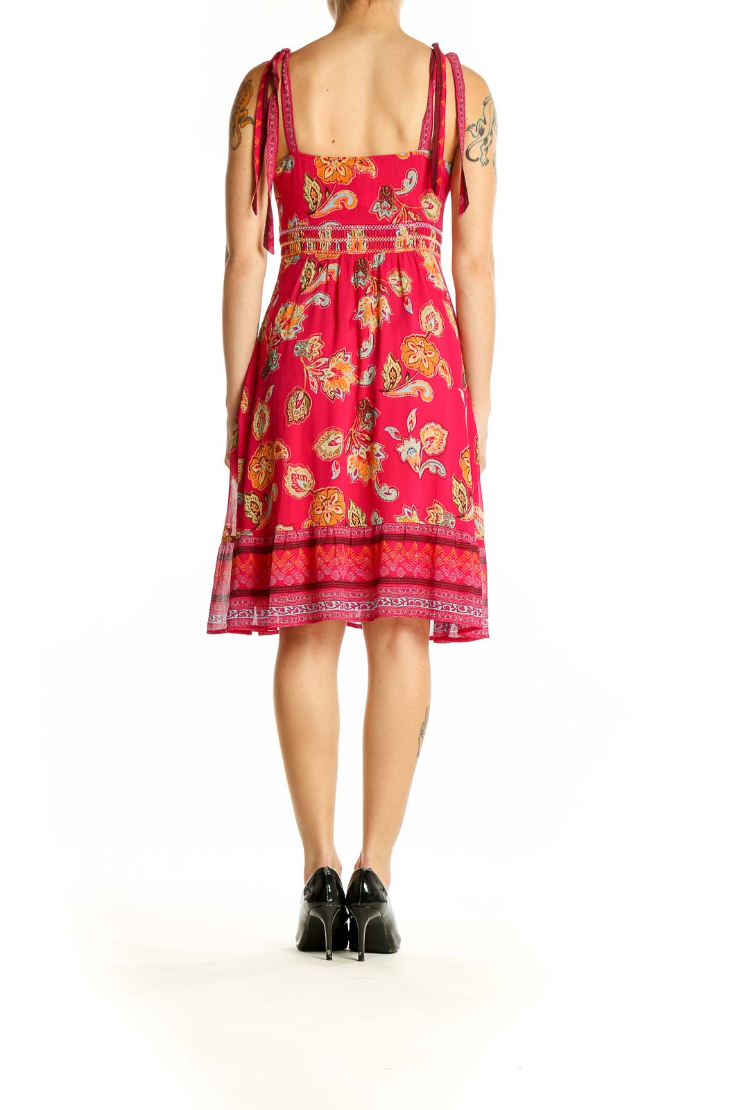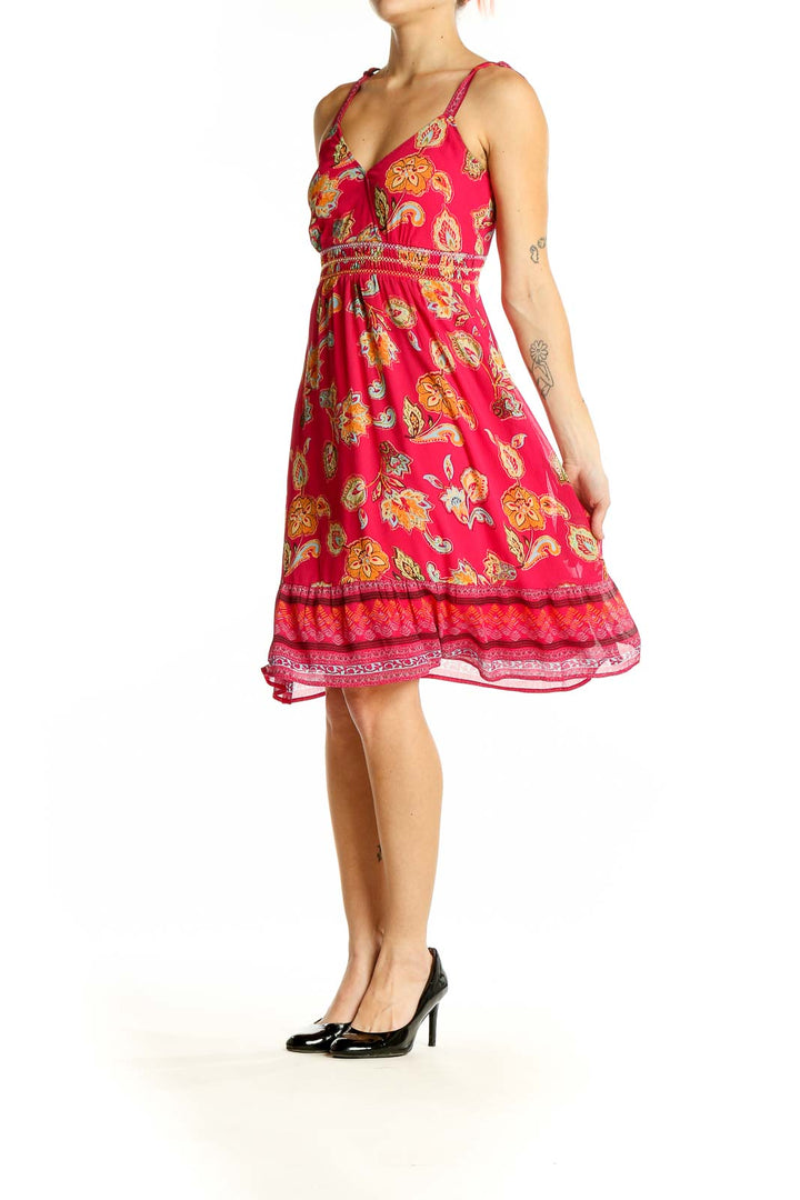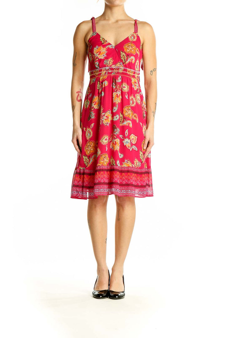 Step into summer with this charming pink floral sundress from Esprit. The vibrant fuchsia background is adorned with a delightful array of orange and yellow blooms, creating a cheerful and eye-catching design. The empire waist silhouette, accentuated by a decorative trim, flatters your figure while providing a comfortable fit.