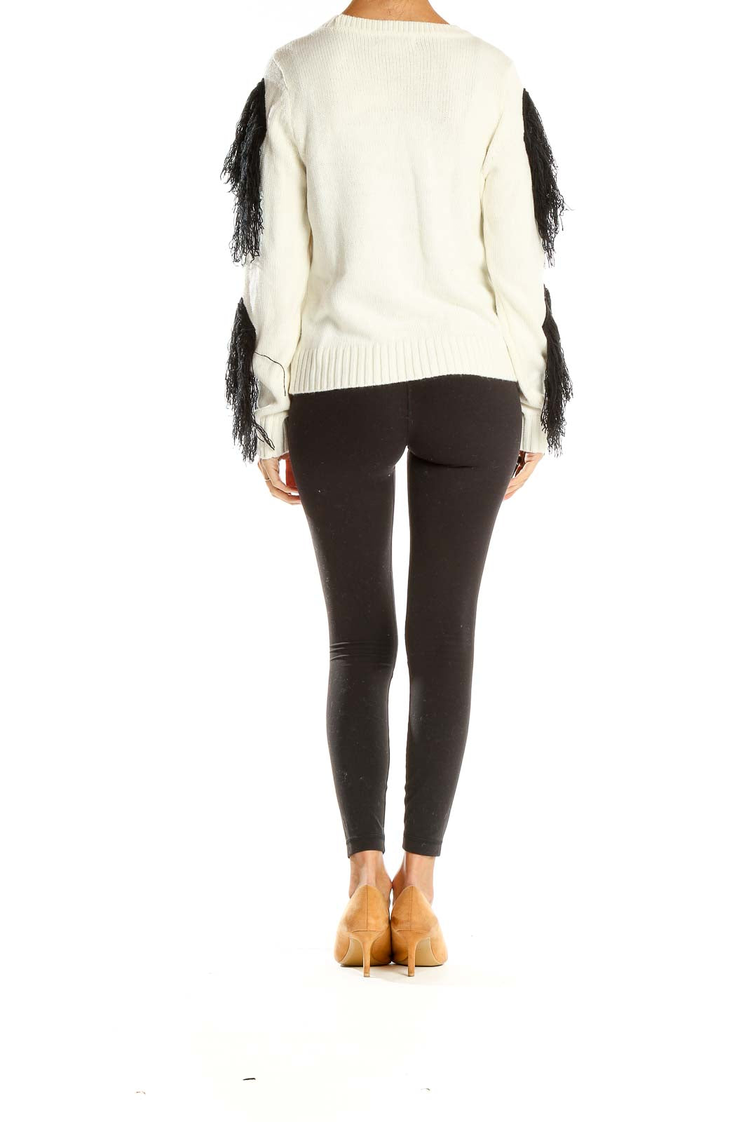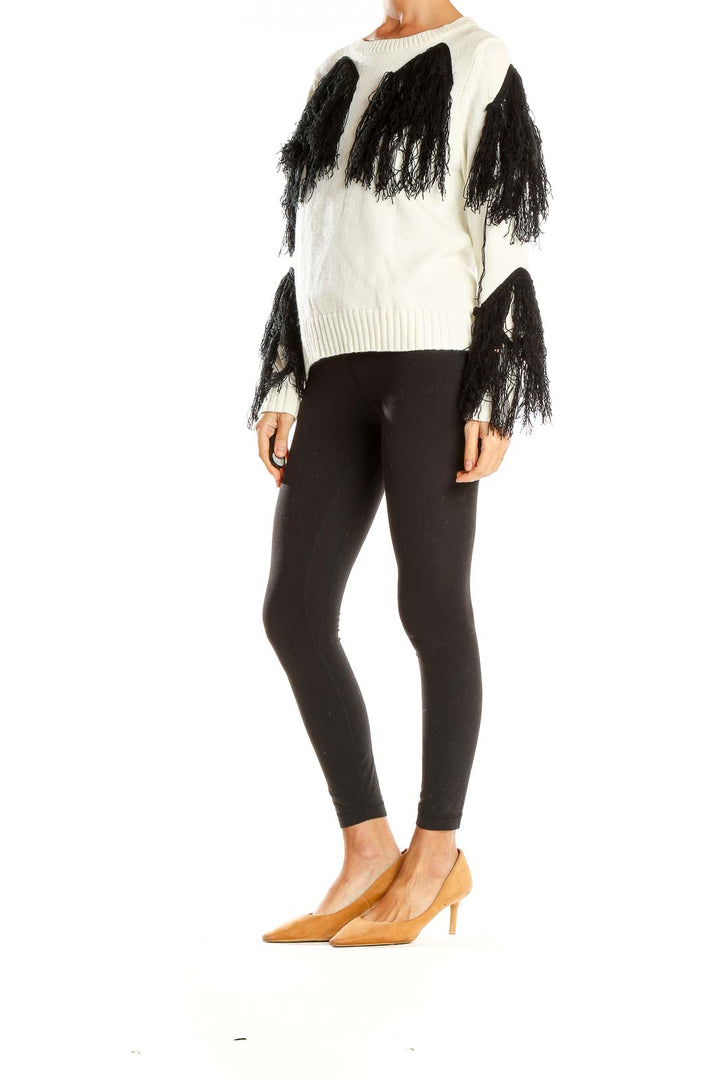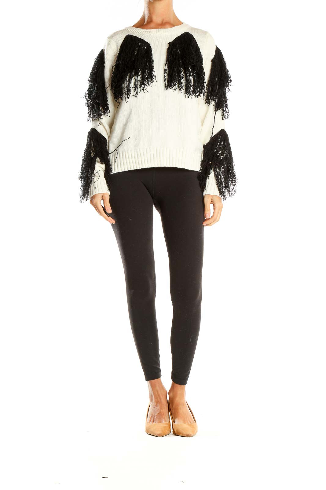 Make a statement with this eye-catching white knit sweater from Eva Mendes | New York & Company. Featuring dramatic black fringe detailing on the sleeves and body, this medium-sized sweater offers a unique and stylish twist on a classic silhouette. Crafted from soft acrylic, it provides both comfort and warmth. The contrasting black fringe against the crisp white background creates a bold, artistic look that's sure to turn heads. With a relaxed fit and a length of 22 inches, this sweater is perfect for pairing with your favorite jeans or leggings for a chic, casual outfit. New with tags, this piece is ready to make its debut in your wardrobe.
