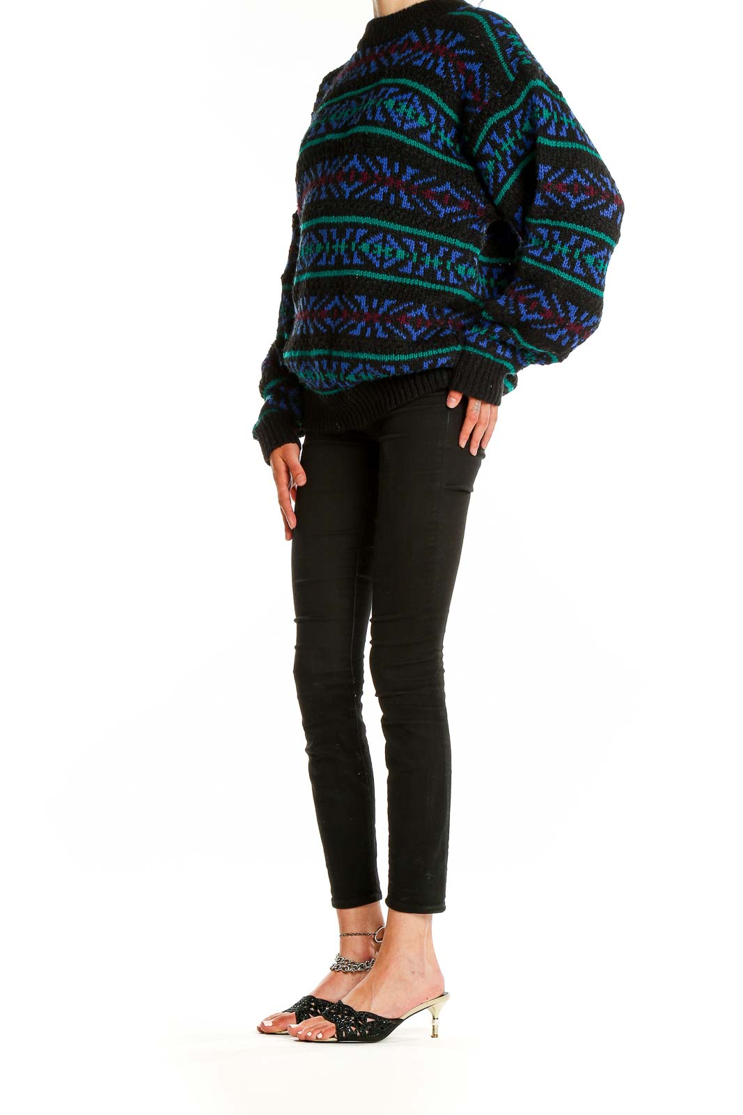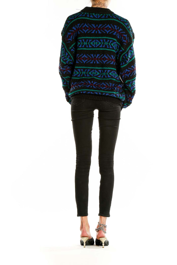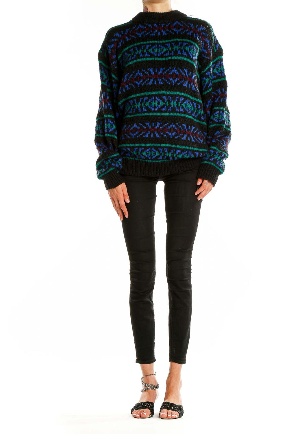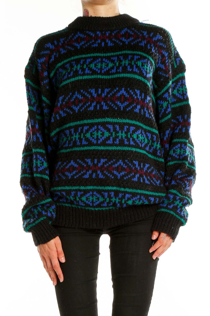 Make a bold statement with this eye-catching Black Geometric Pattern Knit Sweater from Expressions International. This striking piece features an intricate geometric design in vibrant shades of blue and green, creating a mesmerizing visual effect against the black background. The chunky knit texture adds depth and warmth, perfect for those cooler days.