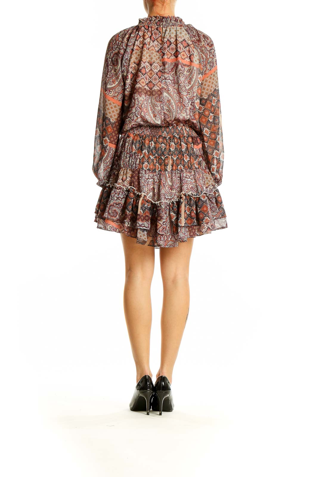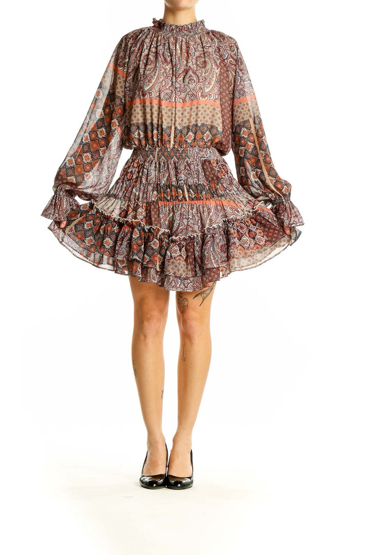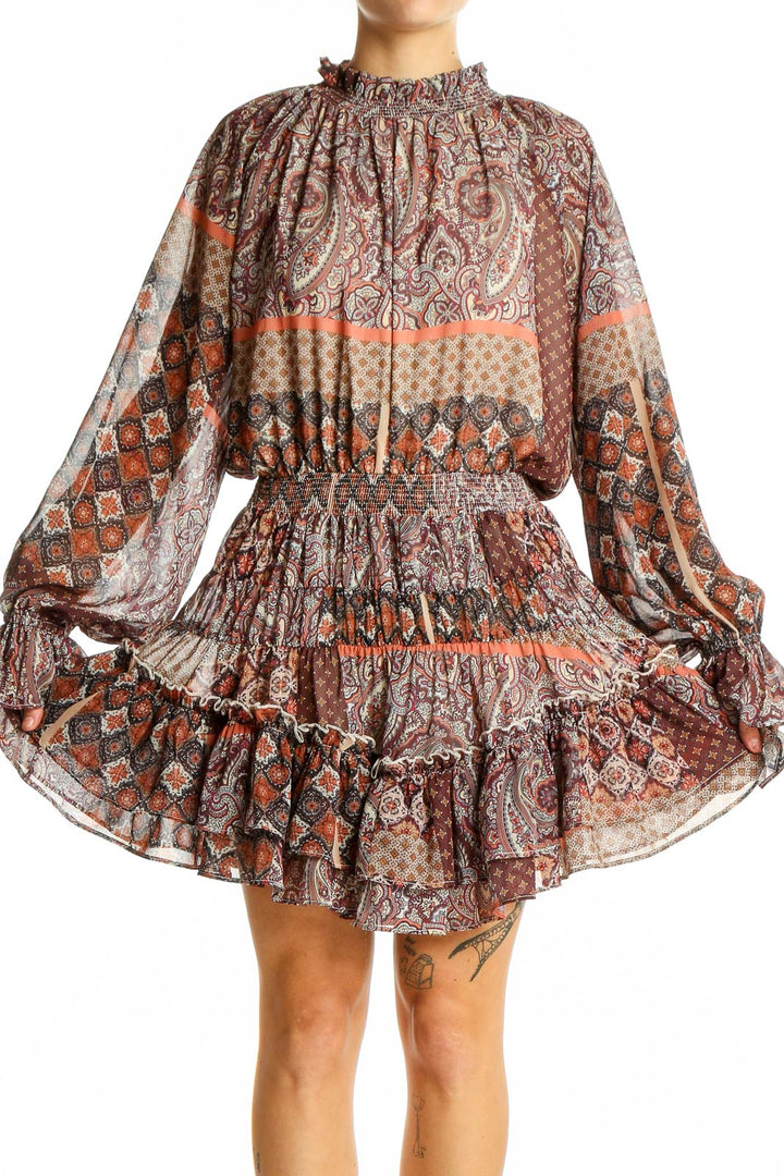 Step into bohemian chic with this stunning brown paisley mini dress by Fate. The intricate paisley pattern in shades of brown, orange, and beige creates a mesmerizing visual appeal, perfect for those who love a touch of vintage-inspired glamour. The dress features a high ruffled neckline and voluminous long sleeves, adding a romantic flair to the silhouette.