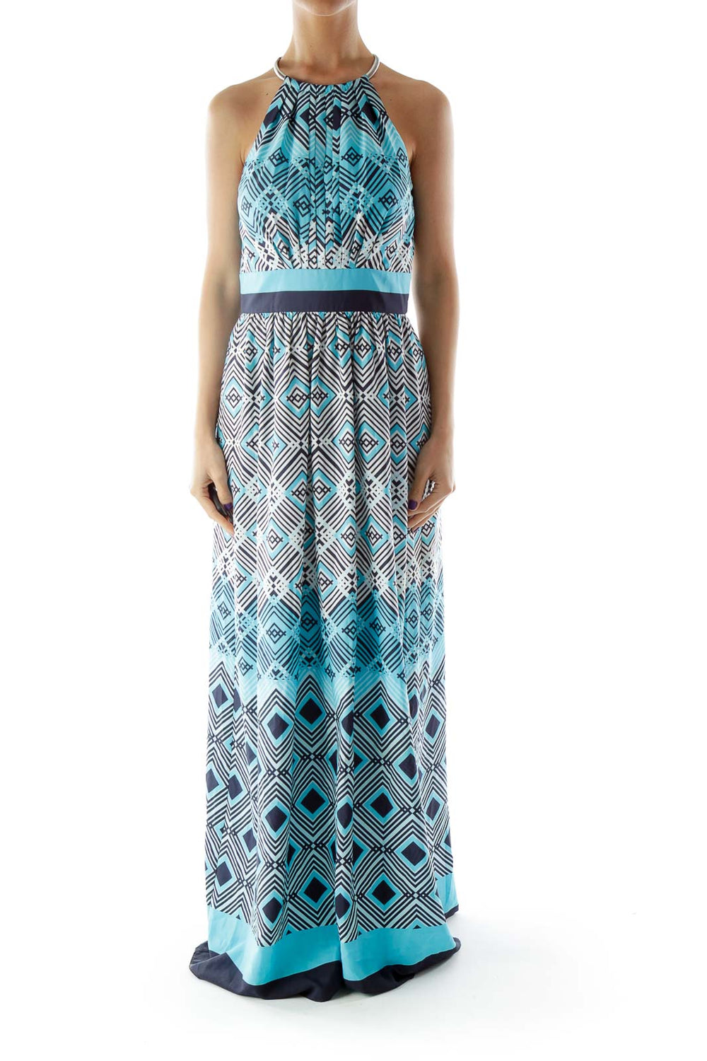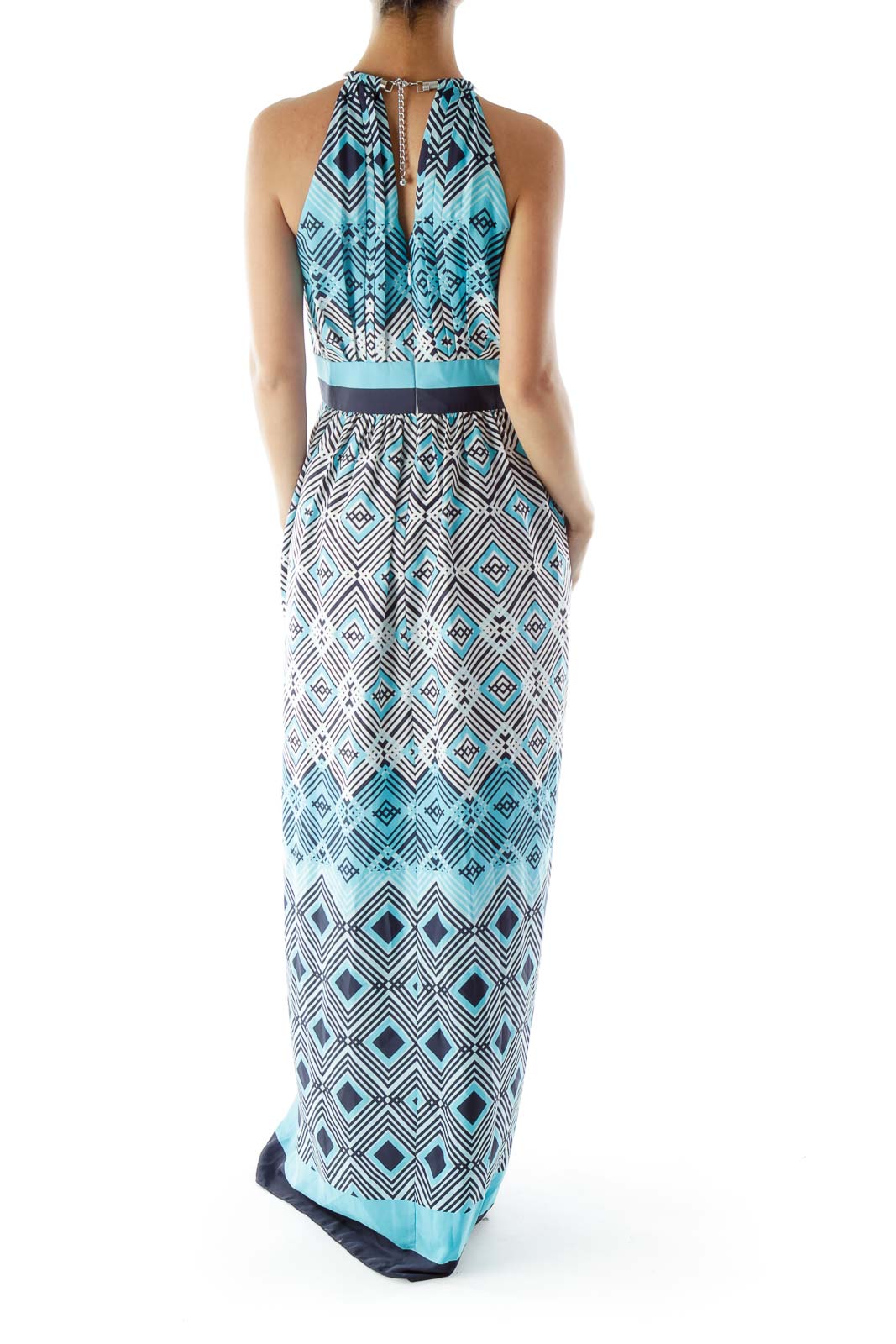 Blue Black White Geometric Print Maxi Dress with Metal Detail