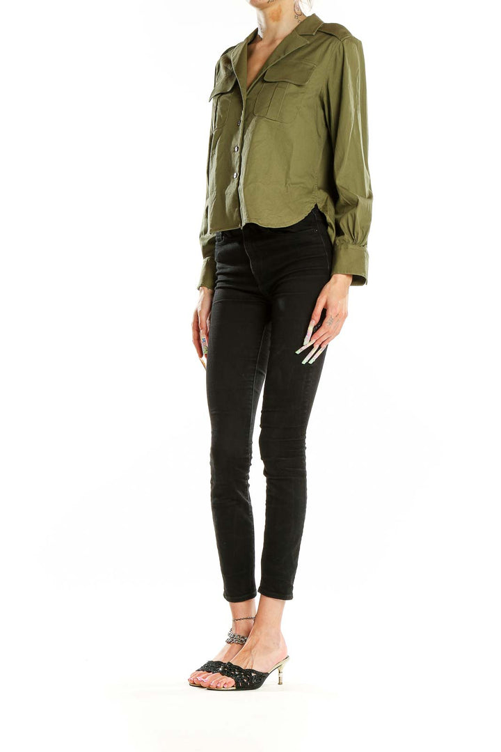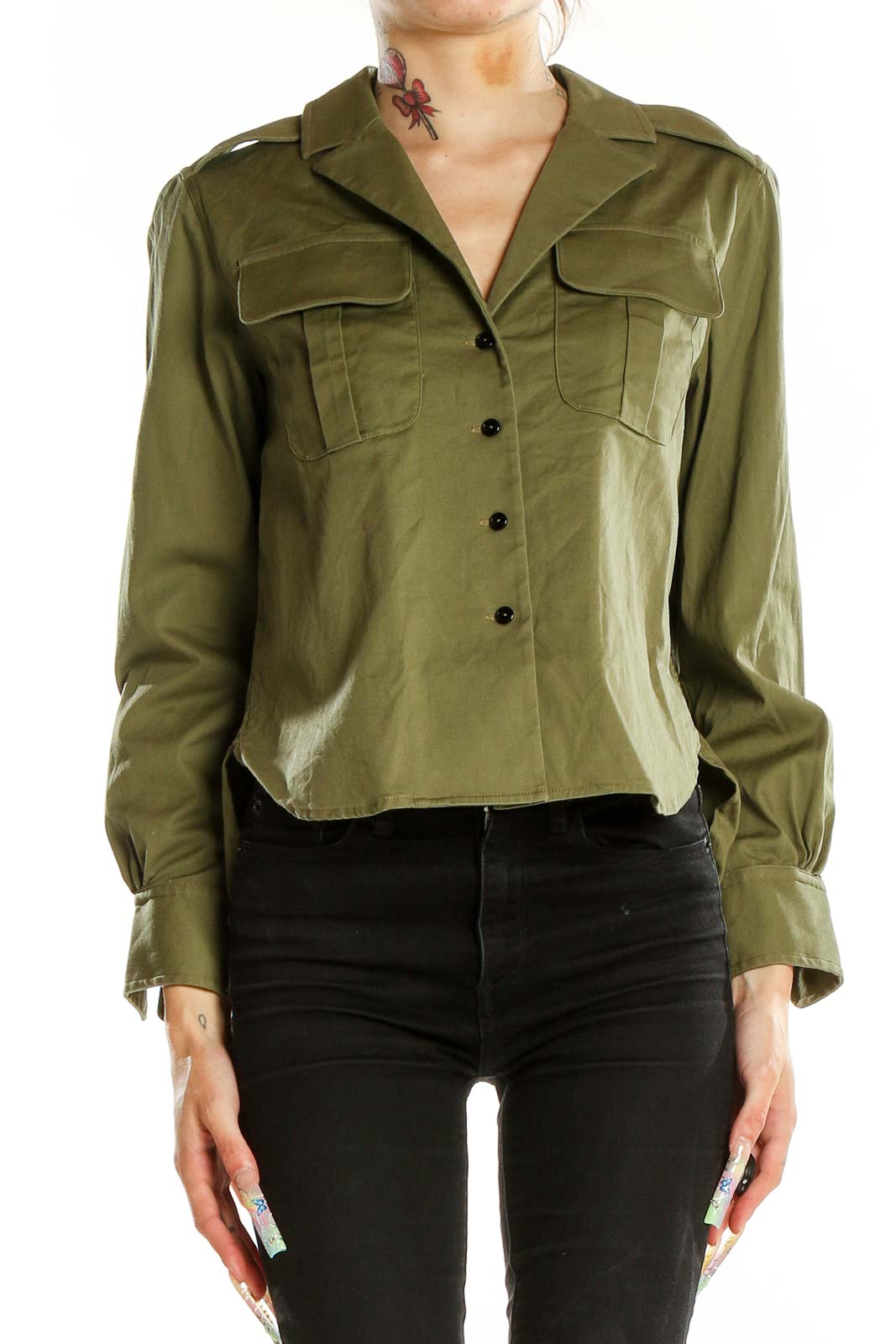 Make a statement with this chic olive military-inspired blouse from esons. Crafted with a sleek silhouette, this top features a classic collar, front button closure, and two functional chest pockets for a touch of utility-chic style. The long sleeves with buttoned cuffs add a polished finish to this versatile piece. Made from a smooth, lightweight fabric that drapes beautifully, this blouse offers both comfort and style. The relaxed fit through the body provides ease of movement, while the slightly cropped length adds a modern edge. Perfect for pairing with high-waisted jeans or tucking into a pencil skirt for a more formal look. In excellent condition, this esons blouse is a wardrobe essential that effortlessly transitions from day to night.
