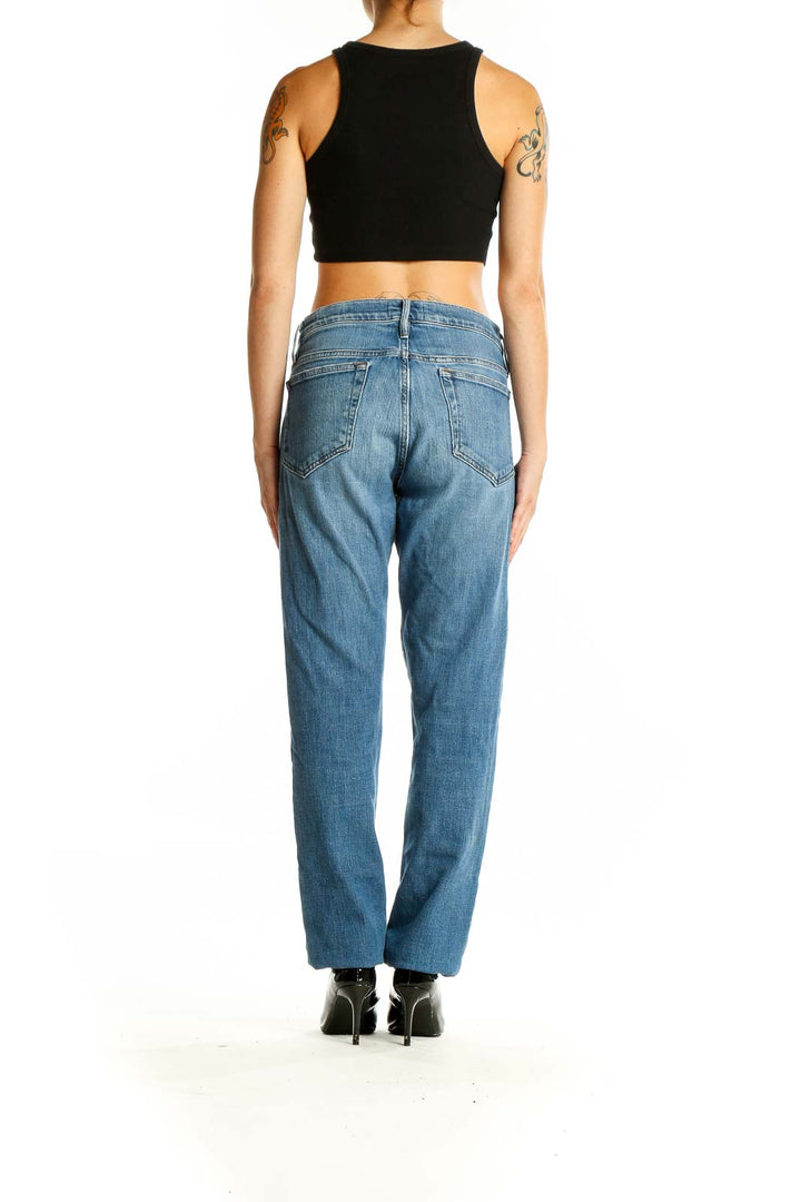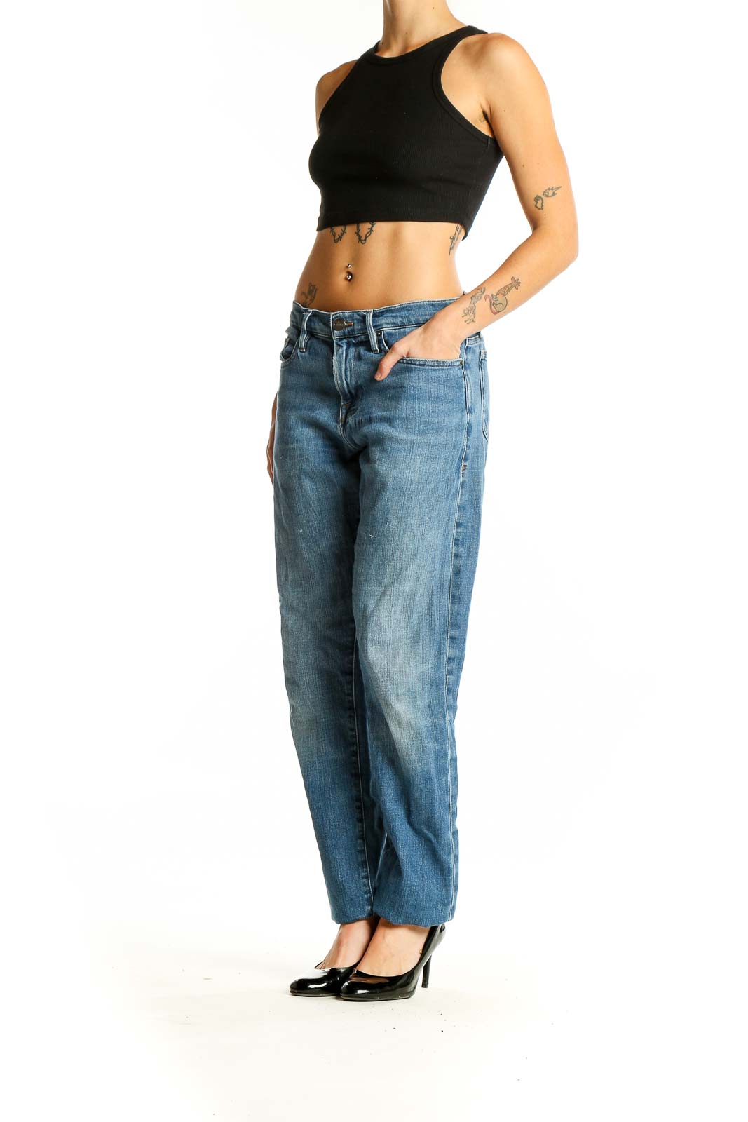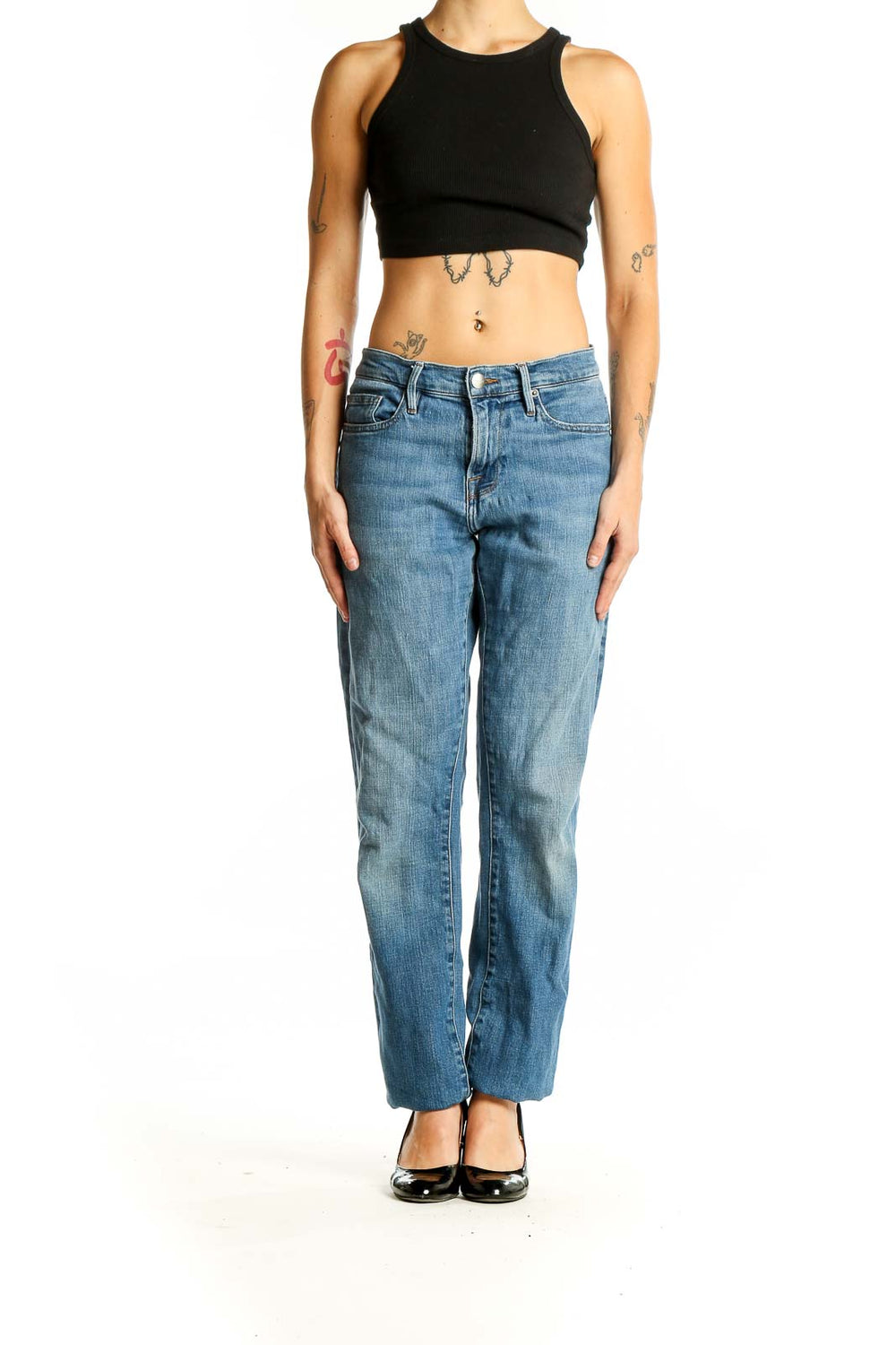 Step into effortless style with these classic blue straight leg jeans from FRAME Denim. Crafted from a comfortable blend of cotton, elastane, and polyester, these jeans offer both durability and stretch for all-day wear. The relaxed fit through the hips and thighs provides a laid-back silhouette, while the straight leg cut creates a timeless look that pairs well with any outfit.