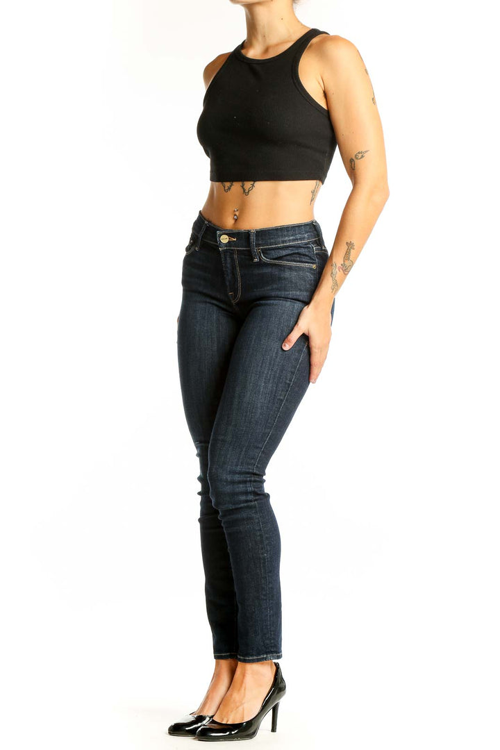Elevate your denim game with these sleek dark blue skinny jeans from FRAME Denim. Crafted from a premium blend of cotton, lycra, and polyester, these jeans offer both comfort and style. The figure-hugging silhouette accentuates your curves while providing excellent stretch for all-day wear. With a waist measurement of 26", hip measurement of 32", and length of 38", these jeans are perfect for those seeking a flattering fit. The excellent condition ensures you'll look polished and put-together every time you slip them on. Pair these versatile jeans with a crop top for a casual look or dress them up with heels for a night out.