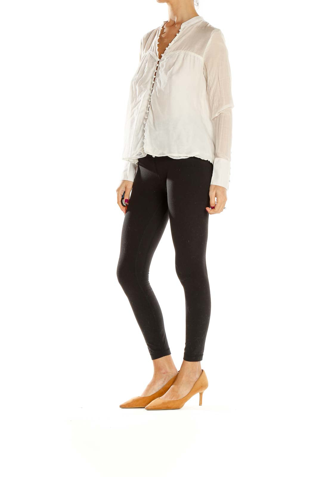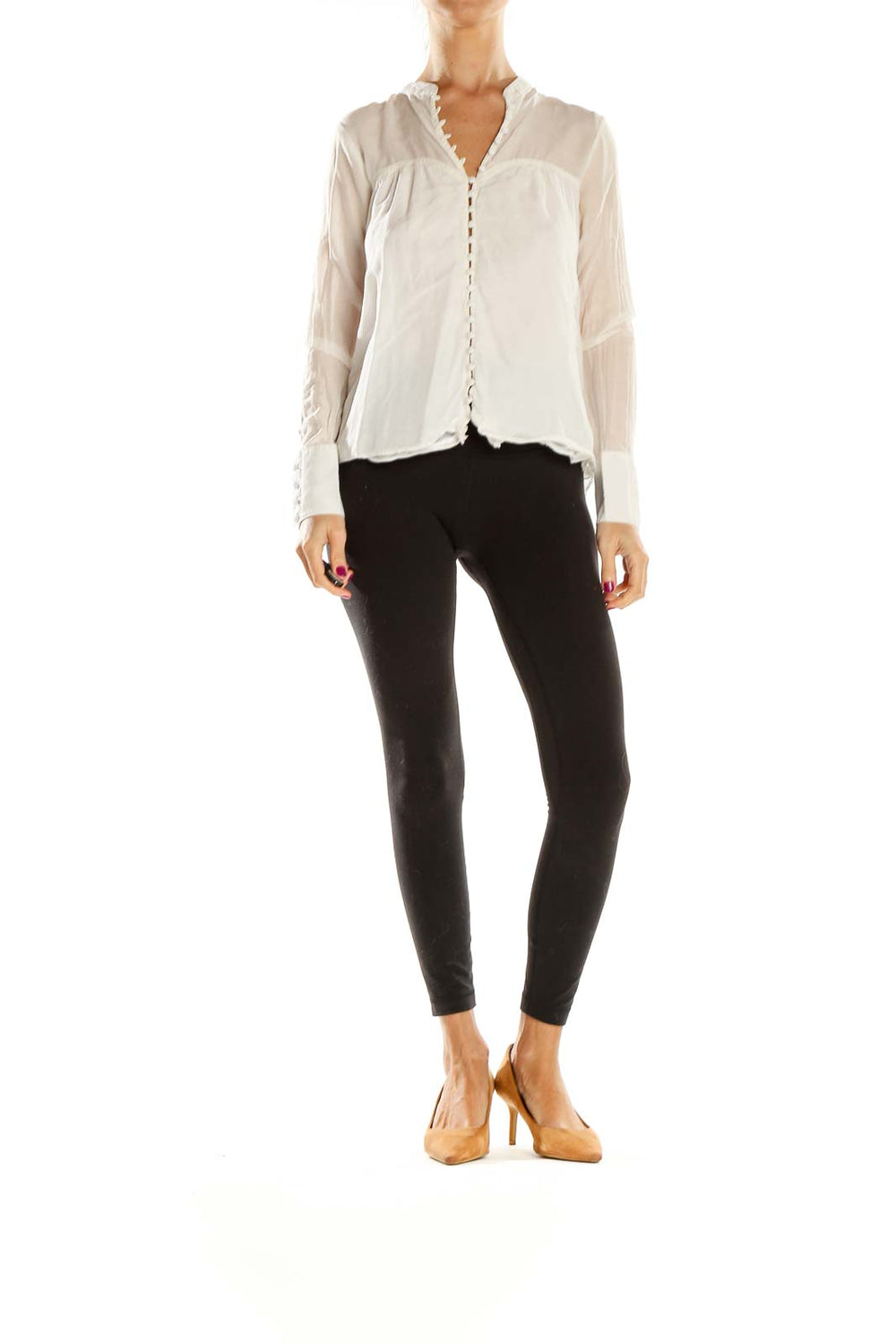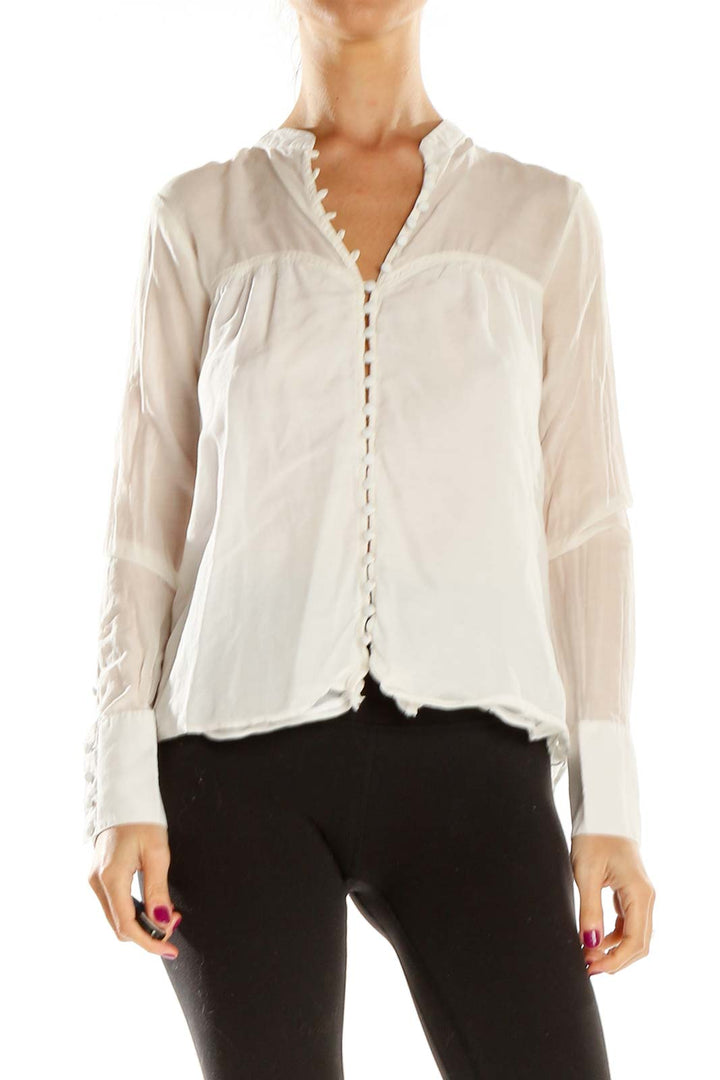 Elevate your wardrobe with this ethereal white sheer blouse from Free People. This exquisite top features a flattering V-neckline adorned with delicate scalloped edges, adding a touch of romance to your look. The long sleeves with gathered cuffs provide a graceful silhouette, while the button-up front allows for versatile styling options. Crafted from a lightweight, semi-sheer fabric, this blouse offers a breezy and comfortable fit perfect for any occasion. The relaxed silhouette with a slightly gathered waist creates a feminine and flattering shape. In good condition, this Free People blouse is a timeless piece that effortlessly combines bohemian charm with modern elegance.