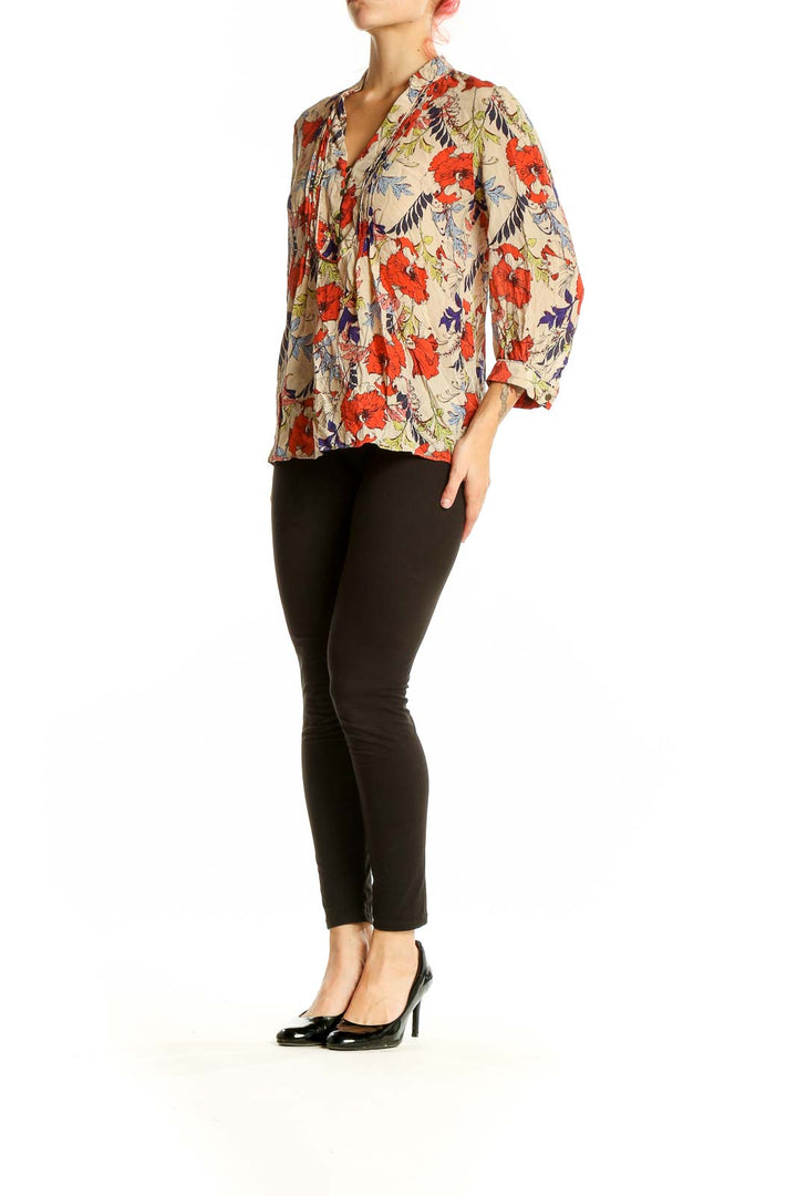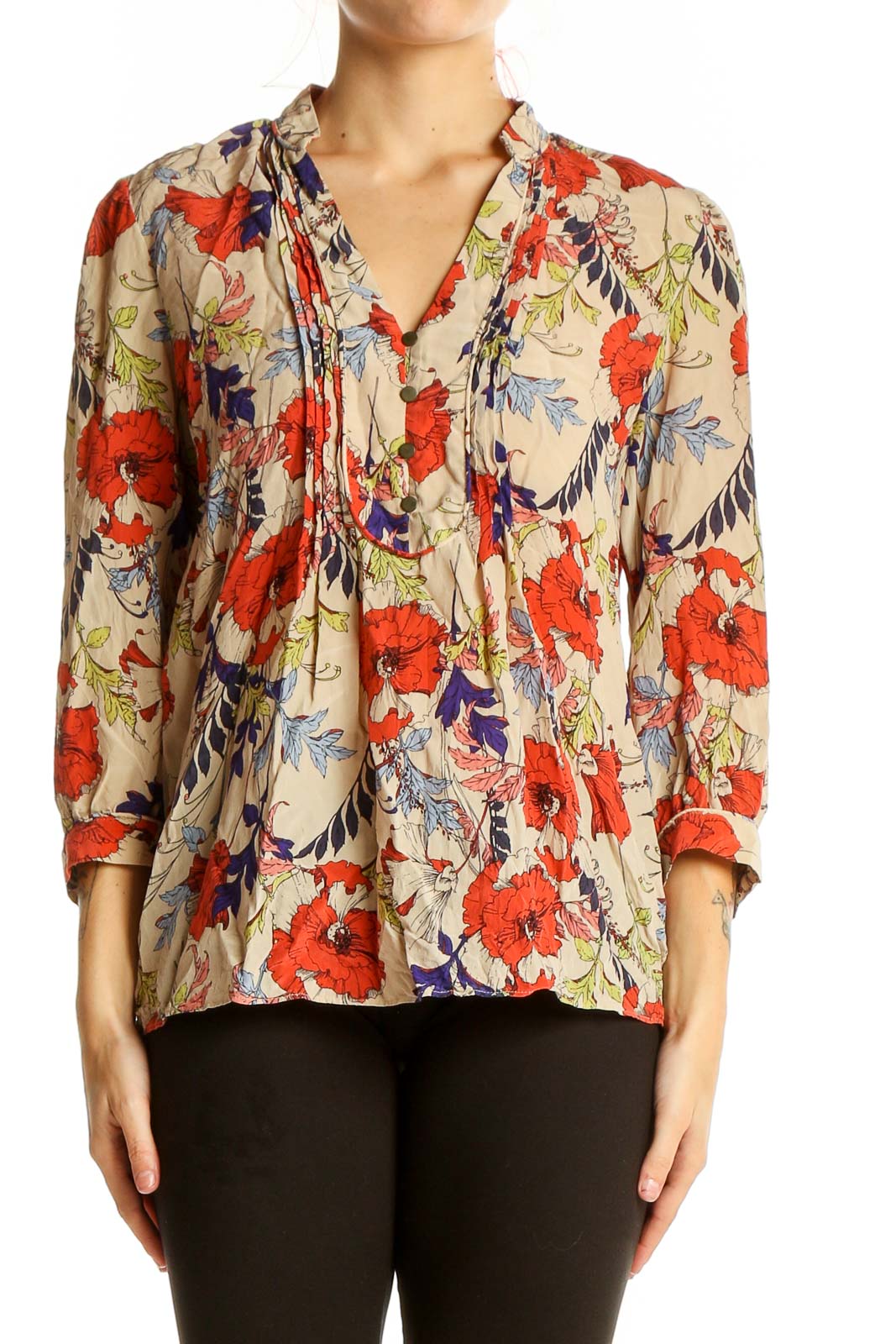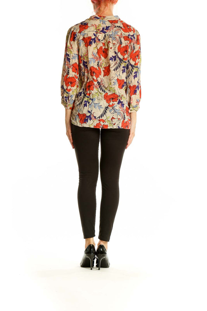 Elevate your wardrobe with this stunning beige silk blouse from Banana Republic. Adorned with a vibrant floral print featuring bold red poppies and delicate blue and purple blooms, this top exudes elegance and charm. The lightweight silk fabric drapes beautifully, offering both comfort and sophistication.