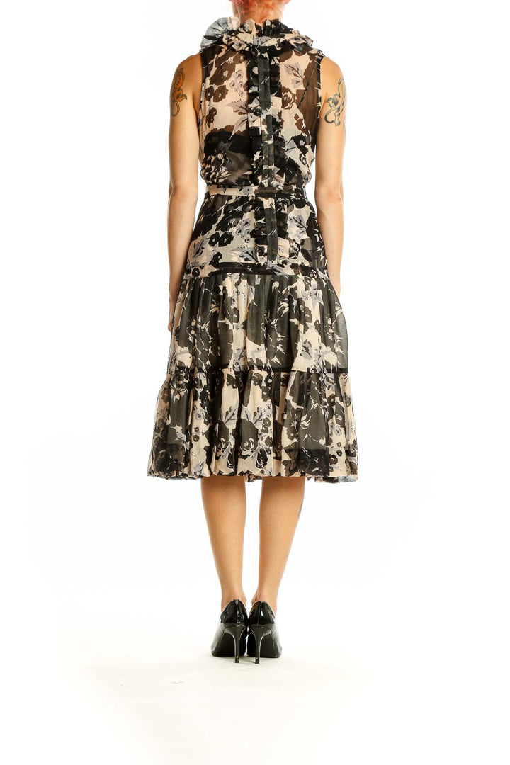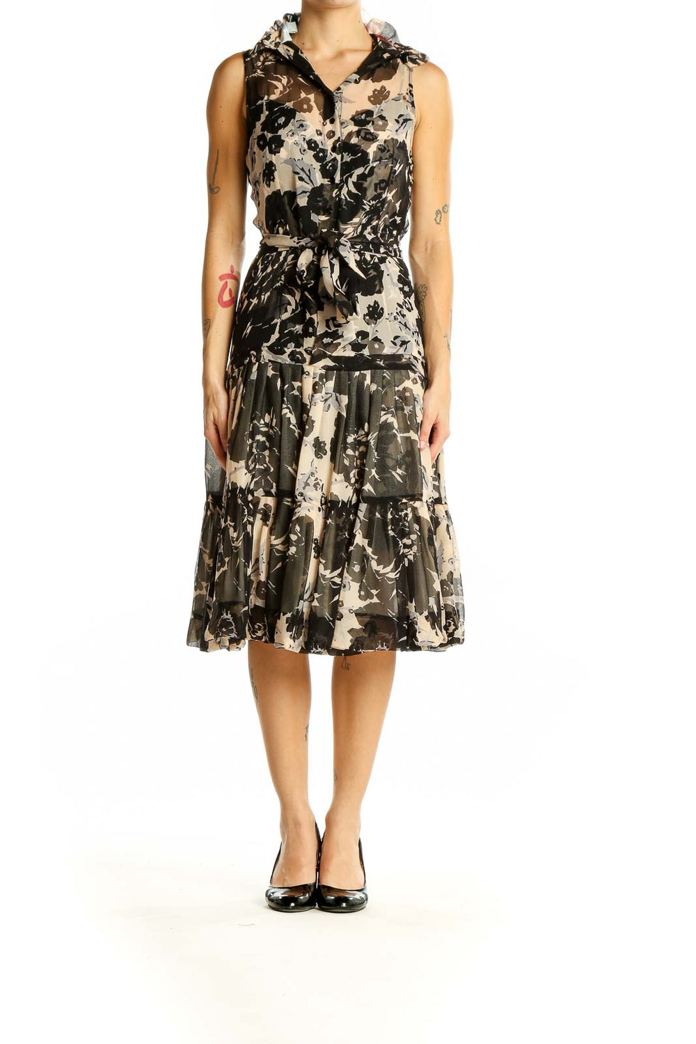 Elevate your wardrobe with this stunning black and beige floral silk midi dress by Tracy Reese. This exquisite piece features a captivating all-over floral print in muted tones, perfect for both day and evening occasions. The sleeveless design showcases a flattering V-neckline and a cinched waist with a tie detail, accentuating your silhouette beautifully. The dress flows into a graceful tiered skirt that falls just below the knee, offering elegant movement with every step. Crafted from luxurious silk, this dress promises comfort and a touch of sophistication. Its excellent condition speaks to its quality and care. With its versatile design and timeless appeal, this Tracy Reese dress is sure to become a cherished addition to your collection.