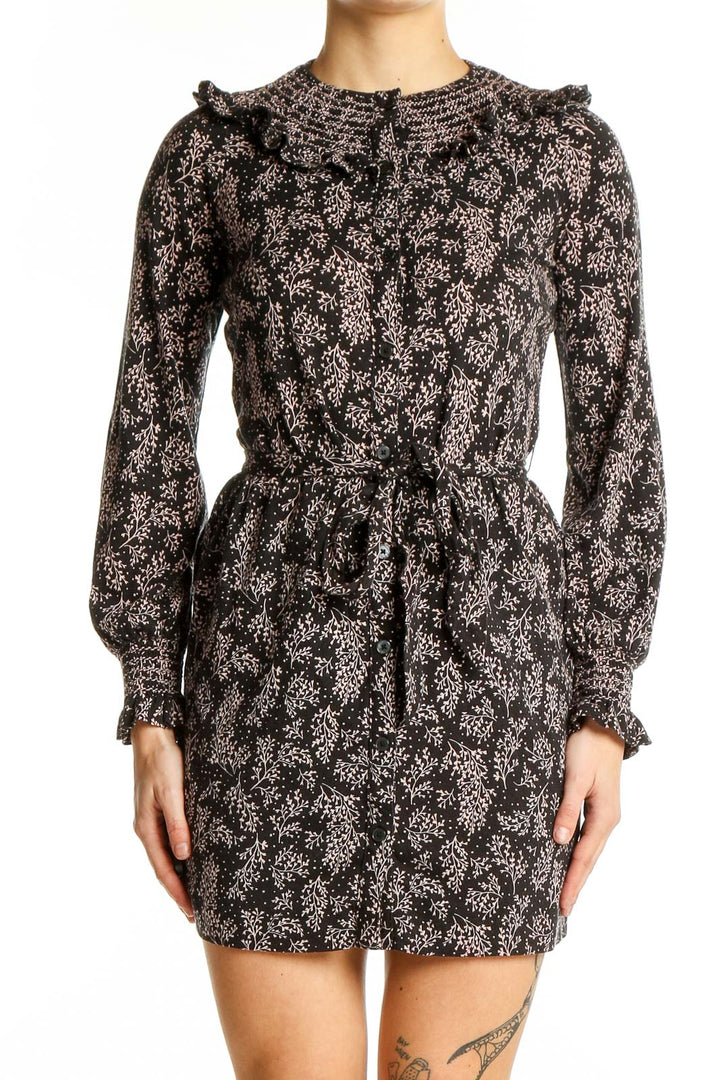 Elevate your wardrobe with this charming black mini dress from Boden, featuring a delicate floral print in soft pink hues. The standout ruffle collar adds a touch of vintage-inspired elegance, while the long sleeves with gathered cuffs provide a romantic silhouette. Crafted from a luxurious blend of Algadon, Cotton, and Modal, this dress offers both comfort and style.