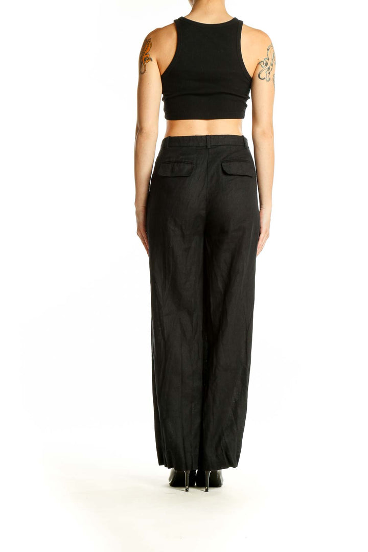 Back view of J.Crew black linen wide-leg trousers on model with crop top
