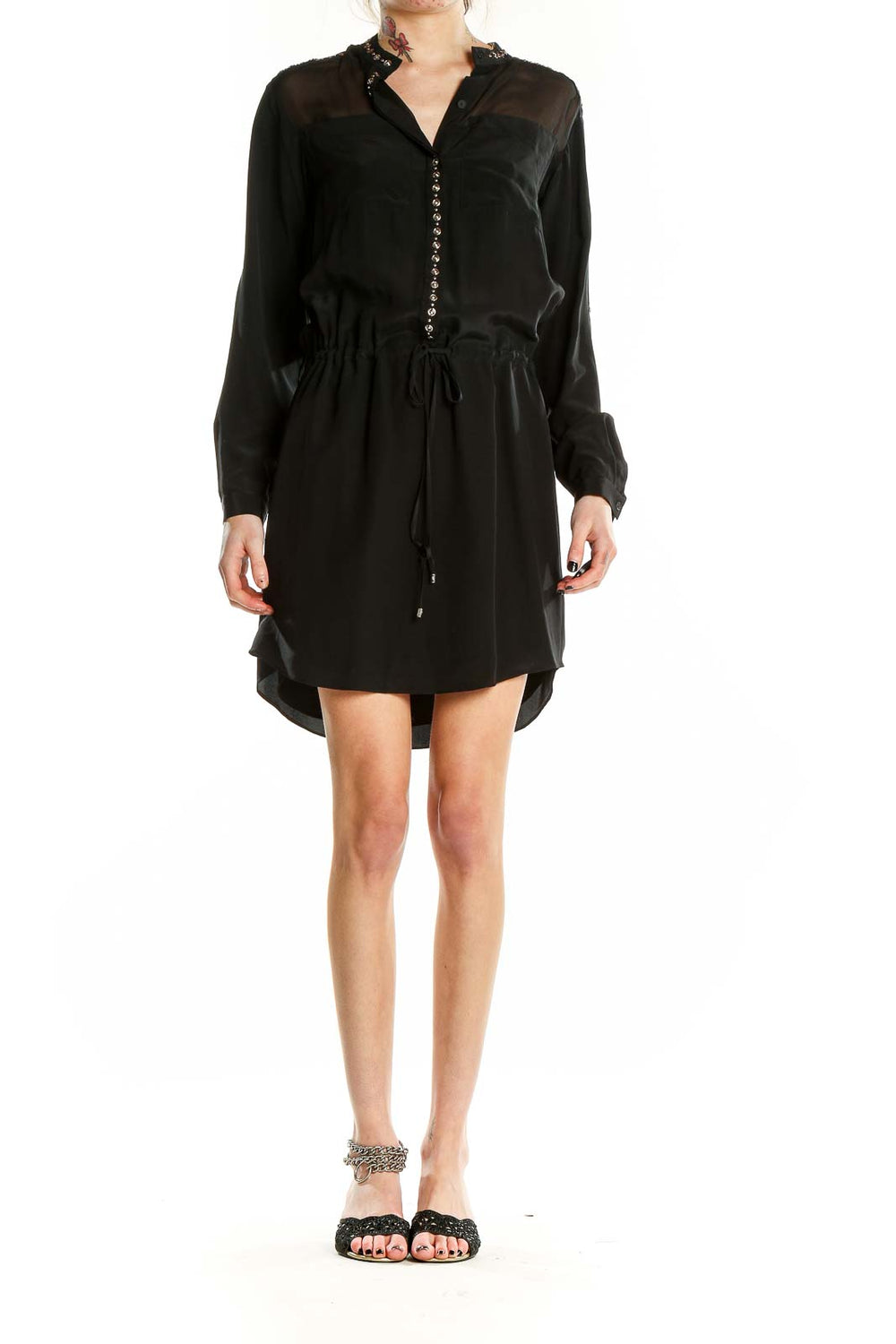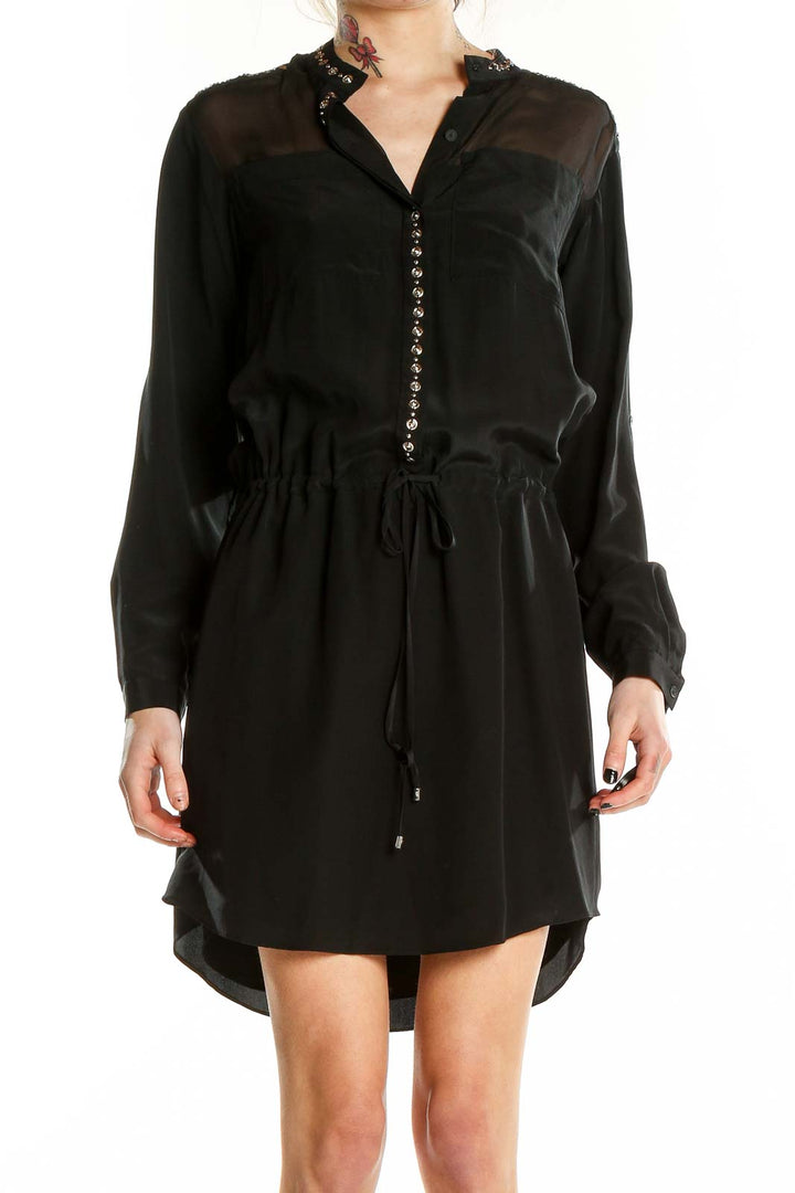Elevate your wardrobe with this chic black shirt dress by Rebecca Taylor. Crafted from a luxurious blend of polyester and silk, this dress offers both comfort and sophistication. The standout feature is the studded collar, adding a touch of edgy glamour to the classic silhouette. The dress features a button-down front, long sleeves, and a flattering drawstring waist that cinches to create a feminine shape. The high-low hemline adds a modern twist, making it perfect for both day and evening wear. In excellent condition, this versatile piece can be dressed up with heels for a night out or paired with flats for a more casual look. The lightweight fabric drapes beautifully, ensuring you'll feel as good as you look.