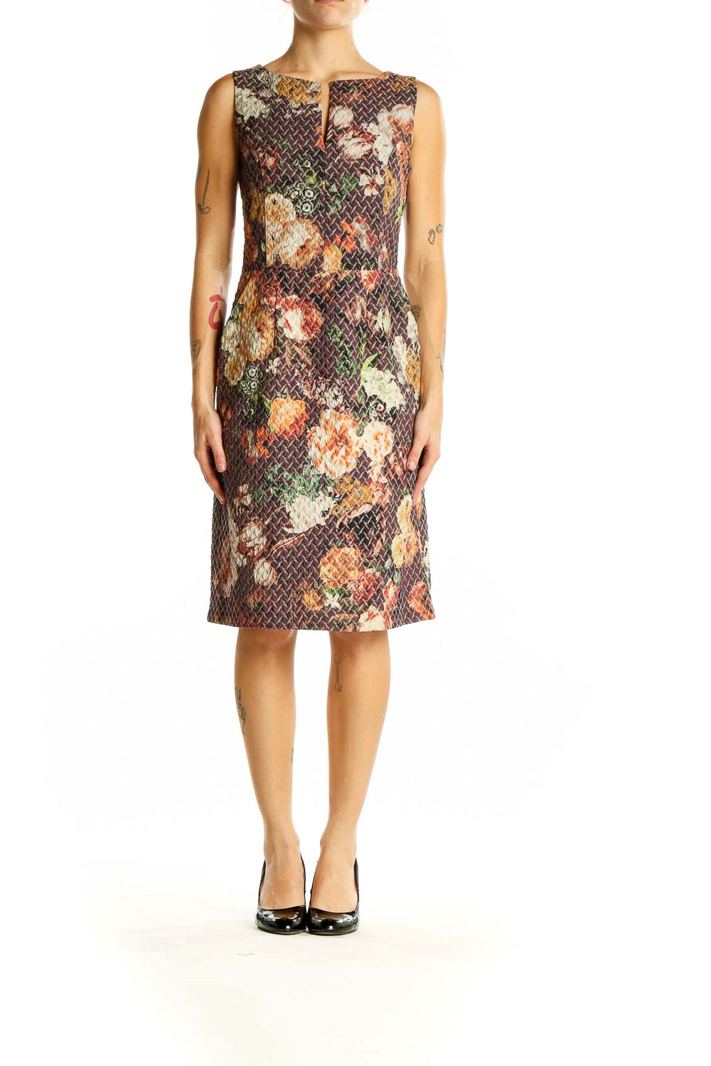 Front view of Tabitha brown floral sleeveless sheath dress with fitted silhouette