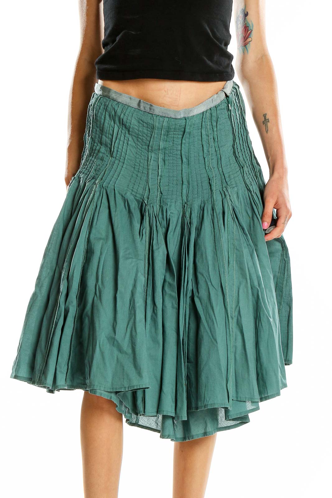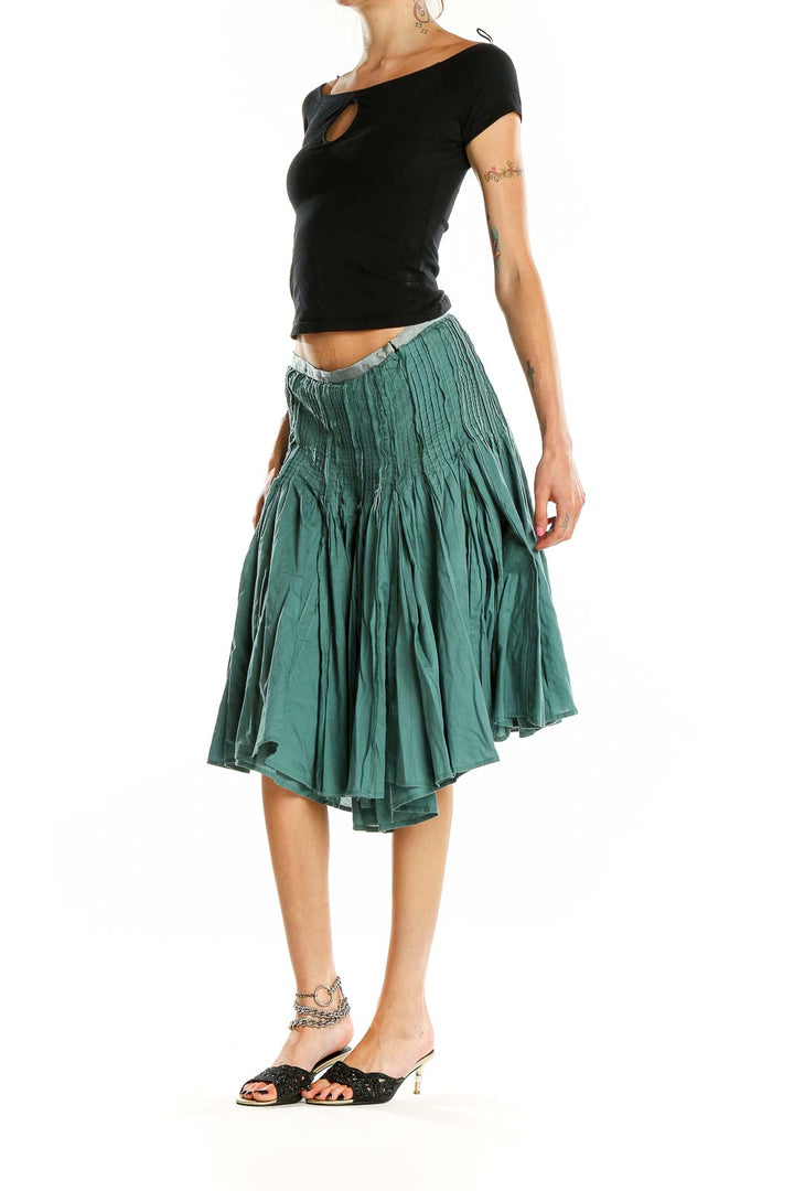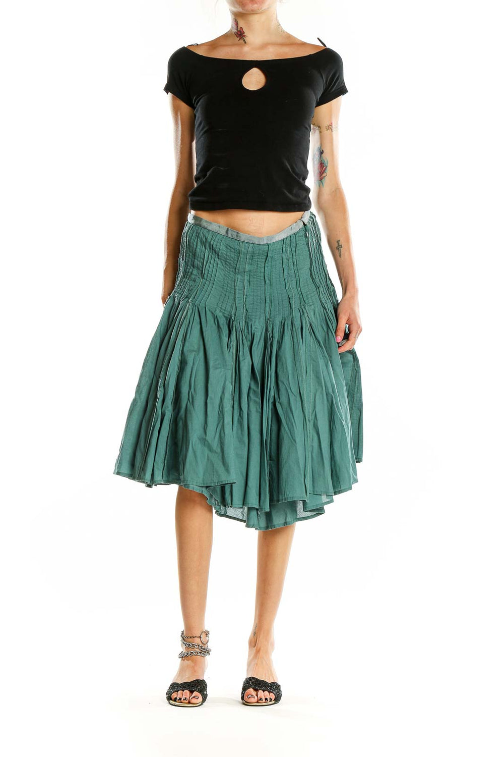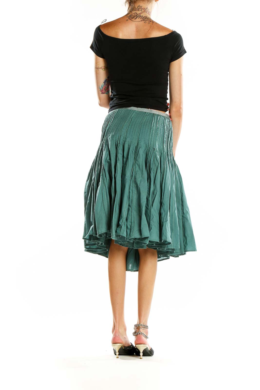 The skirt boasts a flattering high-waisted silhouette with an elastic waistband for comfort and ease of wear. Its full, flowy silhouette creates a graceful drape that flatters various body types. The vibrant green hue is perfect for adding a pop of color to your outfit, making it an ideal choice for spring and summer ensembles.