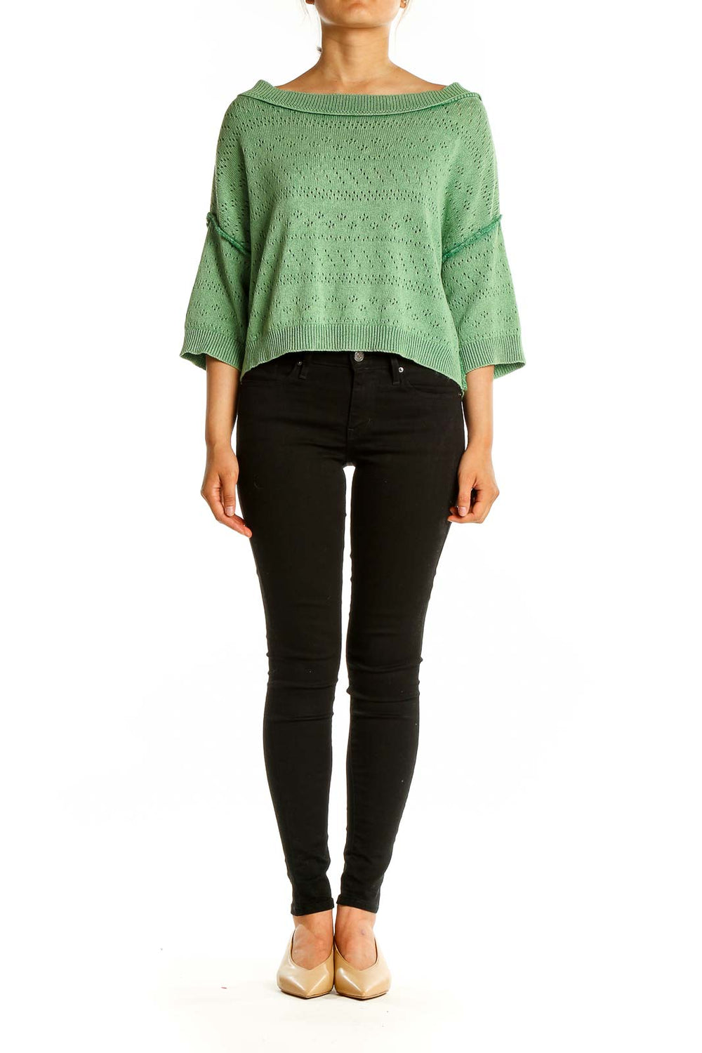 The intricate crochet pattern features delicate eyelet details throughout, creating a beautiful texture and allowing for subtle glimpses of skin. The relaxed fit and cropped length make it versatile for pairing with high-waisted jeans, skirts, or shorts. With its 3/4 length sleeves and wide neckline, this top strikes the perfect balance between casual and dressy.