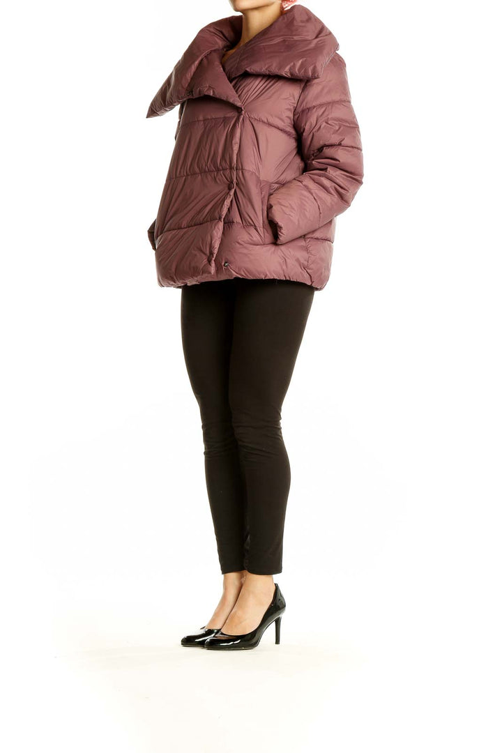 Stay cozy and stylish in this mauve puffer jacket from Banana Republic. The standout feature is the oversized collar, providing extra warmth and a chic look. Made with a blend of nylon and polyester, this jacket offers durability and water resistance. The quilted design adds texture and traps heat efficiently, making it perfect for chilly days. With its relaxed fit and hip-length cut, it's versatile enough to layer over various outfits. The jacket features a wrap-style front closure, adding a touch of sophistication to the casual puffer style. In excellent condition, this XS-sized jacket is a must-have addition to your winter wardrobe.