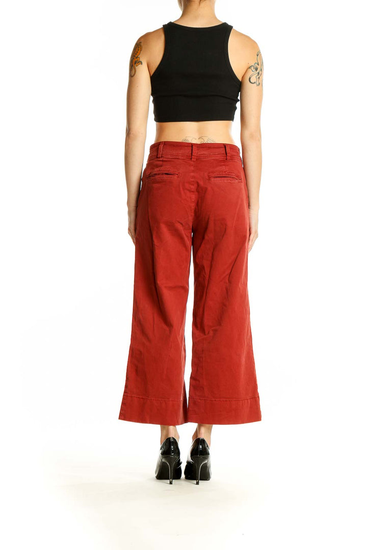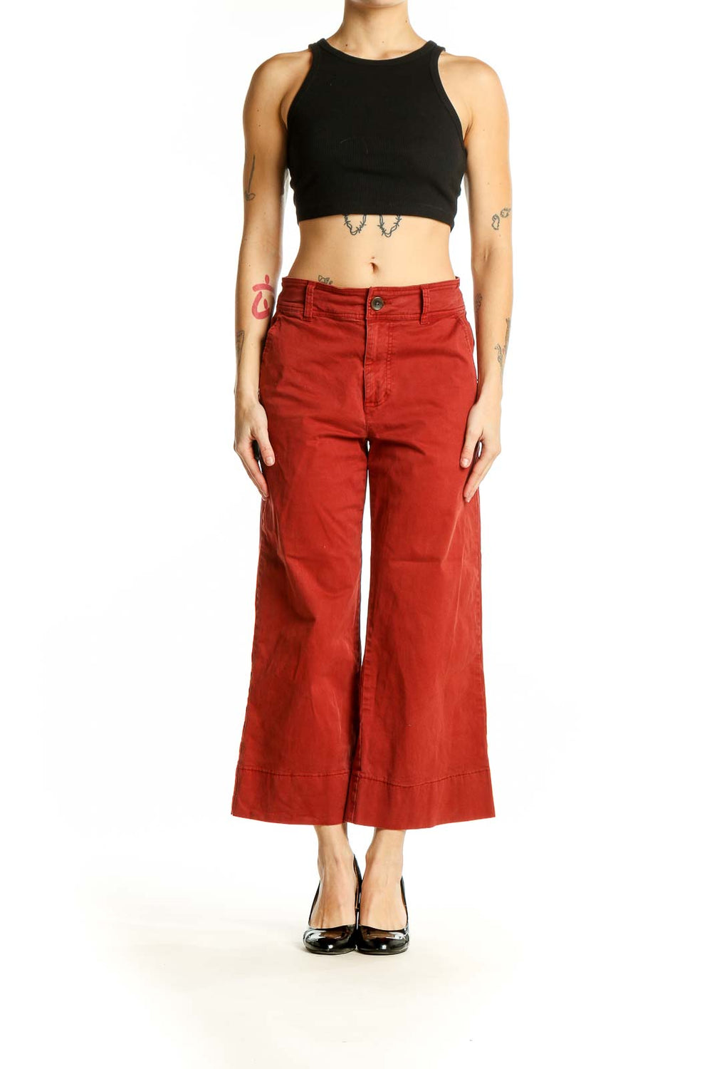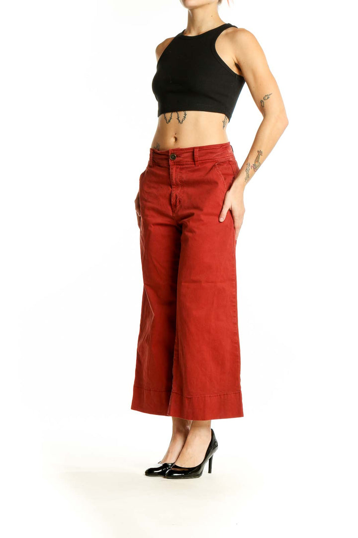 These pants feature a versatile cropped length, hitting just above the ankle for a modern touch. The rich red hue adds a bold pop of color to your wardrobe, making these pants a standout piece for any outfit. With a button closure and zip fly, they offer a secure and comfortable fit.