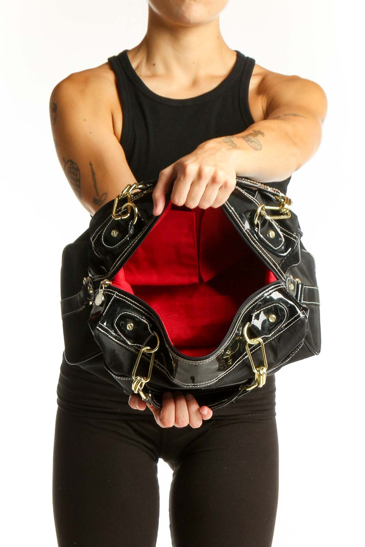 Elevate your accessory game with this sleek and stylish black shoulder bag from Issac Mizrahi. This versatile piece features a chic combination of smooth fabric and glossy patent leather trim, creating a sophisticated look that's perfect for both day and night. The bag's spacious interior, measuring 11" in width, offers ample room for all your essentials, while the 6" depth ensures it maintains a slim profile.