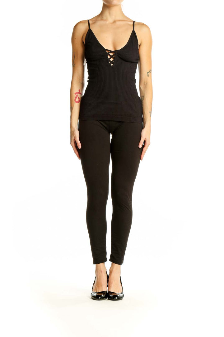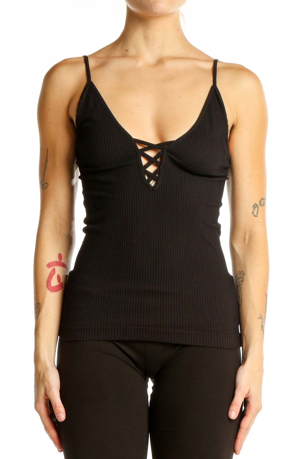 Elevate your casual wardrobe with this sleek black ribbed camisole from Intimately Free People. The form-fitting design features a flattering V-neckline adorned with an eye-catching lace-up detail, adding a touch of allure to this versatile piece. Crafted from a soft, stretchy ribbed fabric, this top offers both comfort and style for all-day wear.