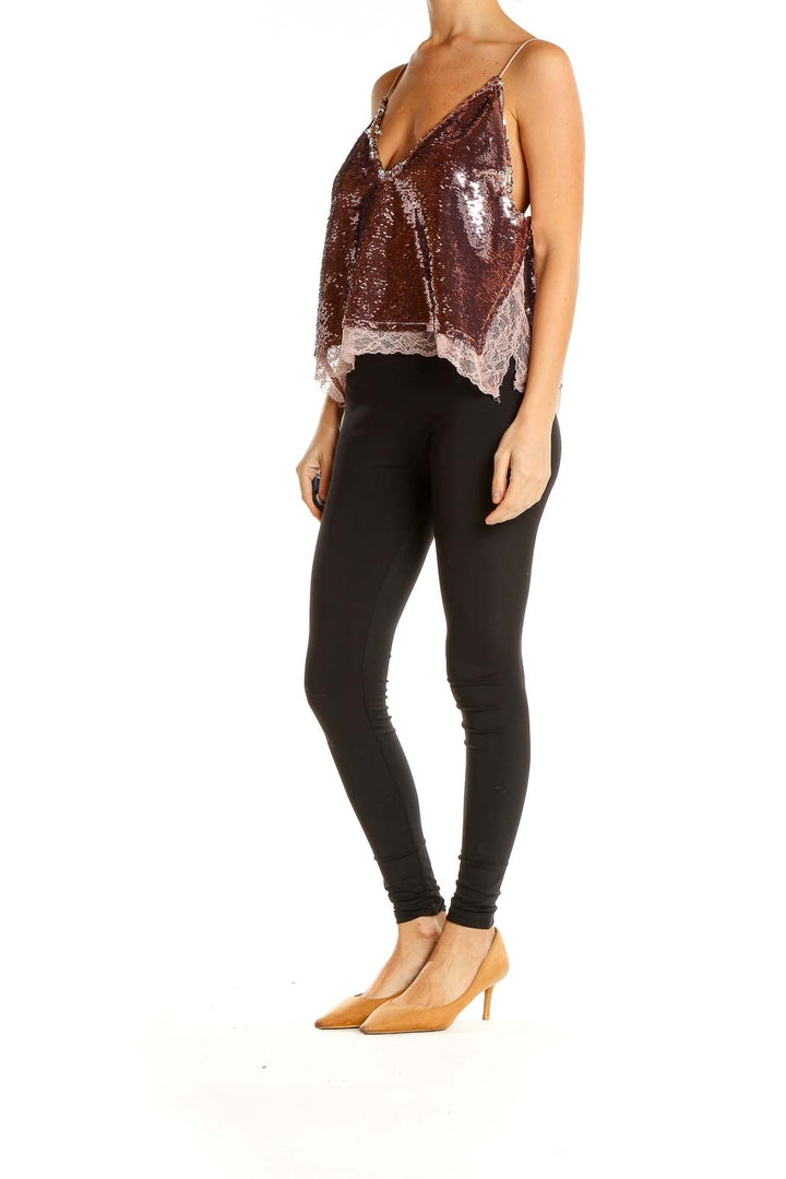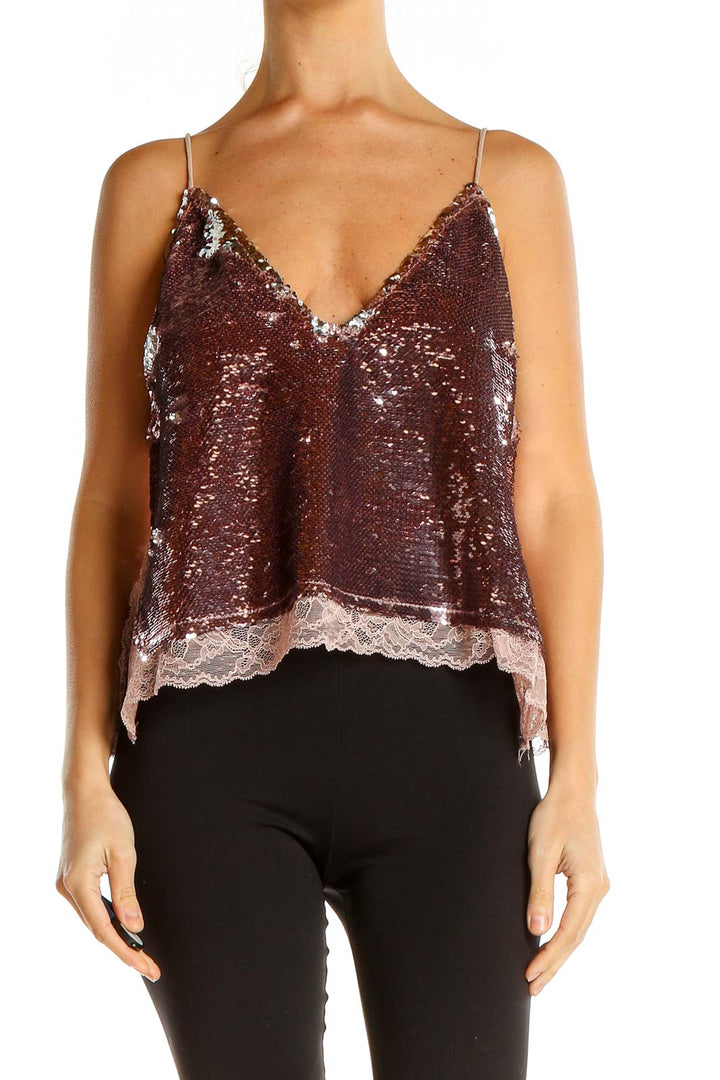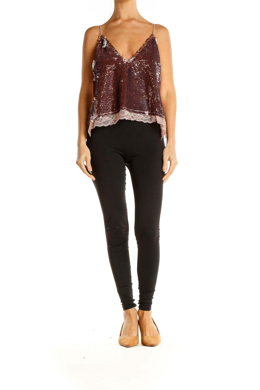 Elevate your evening look with this stunning burgundy sequin camisole from Intimately Free People. This exquisite top features a dazzling all-over sequin design that catches the light beautifully, creating a mesmerizing effect. The delicate lace trim along the hem adds a touch of romantic elegance, perfectly balancing the glamorous sequins.