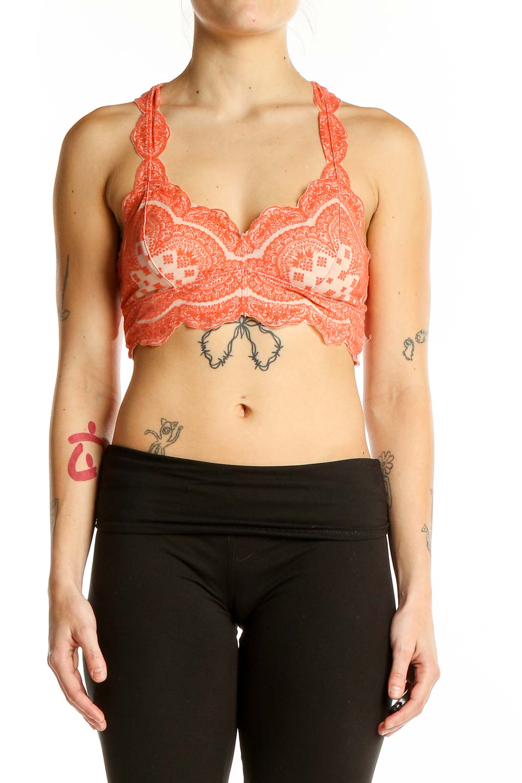 Elevate your lingerie collection with this stunning coral lace bralette from Intimately Free People. Crafted from a soft and stretchy blend of nylon and spandex, this delicate piece features an intricate lace pattern that adds a touch of romance to your look. The racerback design with scalloped edges offers both style and support, while the plunging neckline creates a flattering silhouette. Perfect for layering under sheer tops or wearing as a stylish crop top, this versatile bralette combines comfort and fashion effortlessly. In good condition, this XS-sized bralette measures 26" in the bust, 25" in the waist, and 13" in length, ensuring a snug and comfortable fit for petite frames.