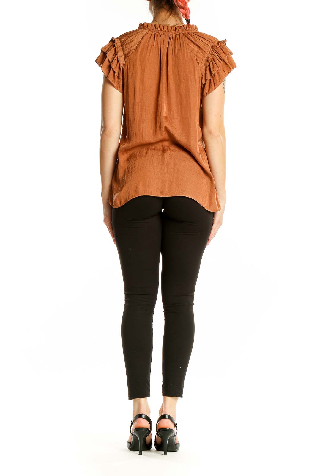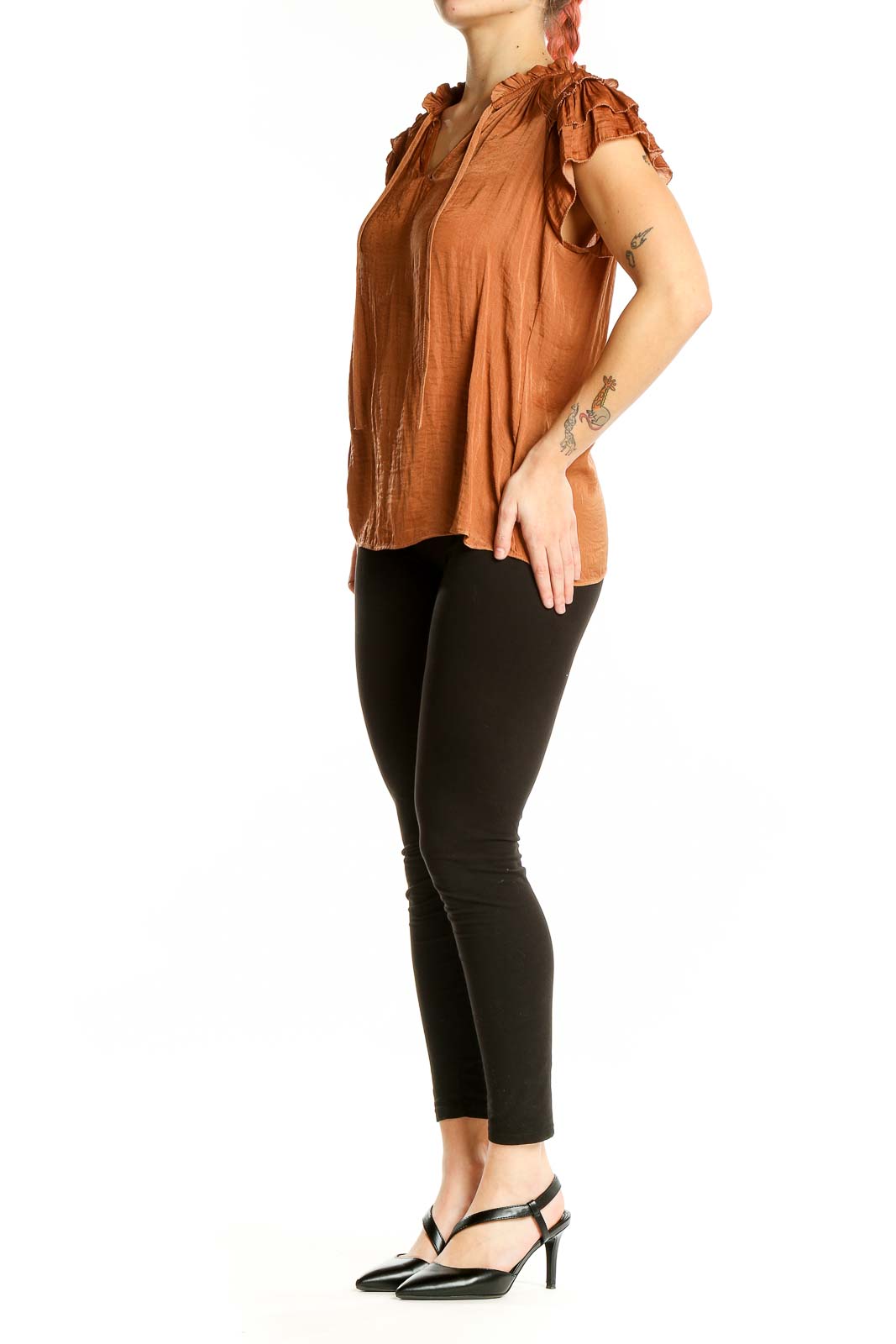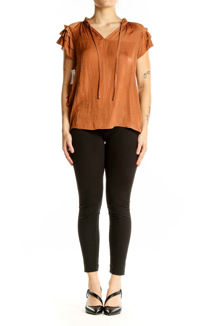 Elevate your wardrobe with this charming terracotta blouse from Rachel Zoe. Crafted from lightweight polyester, this top features a flattering V-neckline with delicate ties and eye-catching ruffle details on the cap sleeves. The flowy silhouette offers a comfortable and versatile fit, perfect for both casual outings and dressier occasions. The rich terracotta hue adds a warm, earthy touch to your ensemble, making it an ideal piece for transitioning between seasons. In good condition, this blouse measures 38" in the bust, 40" at the waist, and 24" in length, offering a relaxed fit that drapes beautifully on the body. Pair this Rachel Zoe blouse with your favorite jeans or tailored trousers for a polished, effortless look.