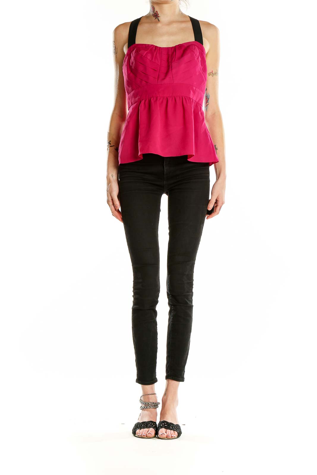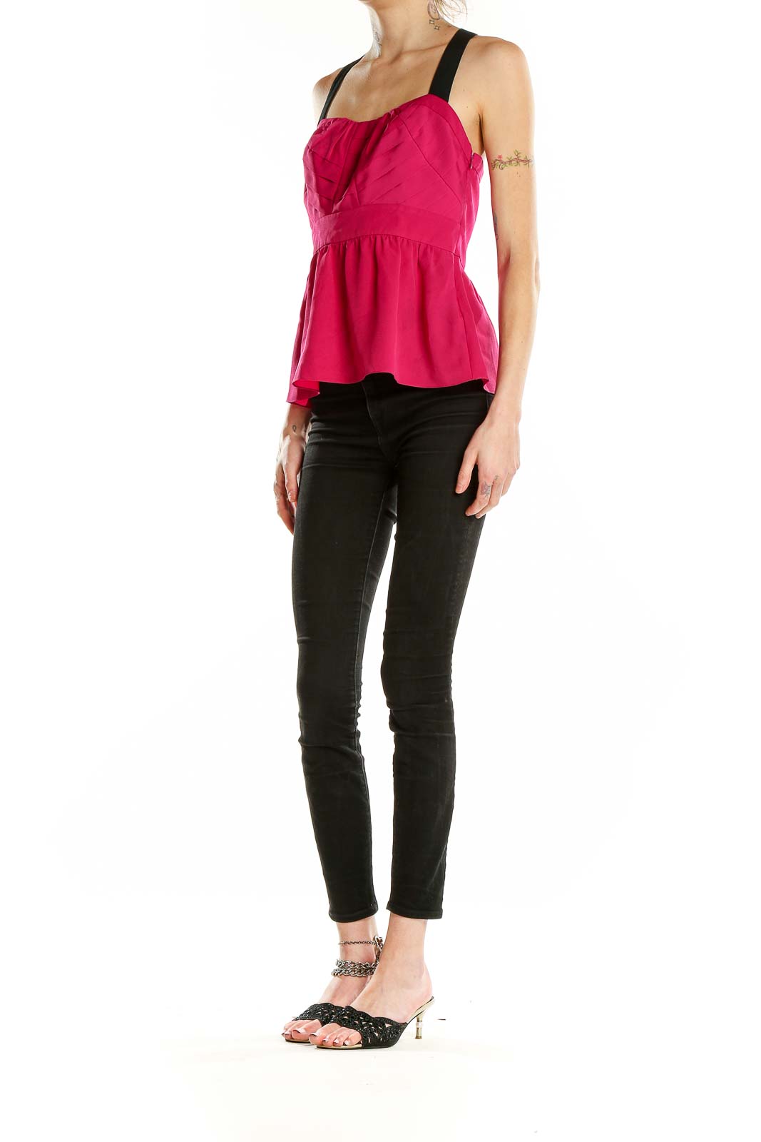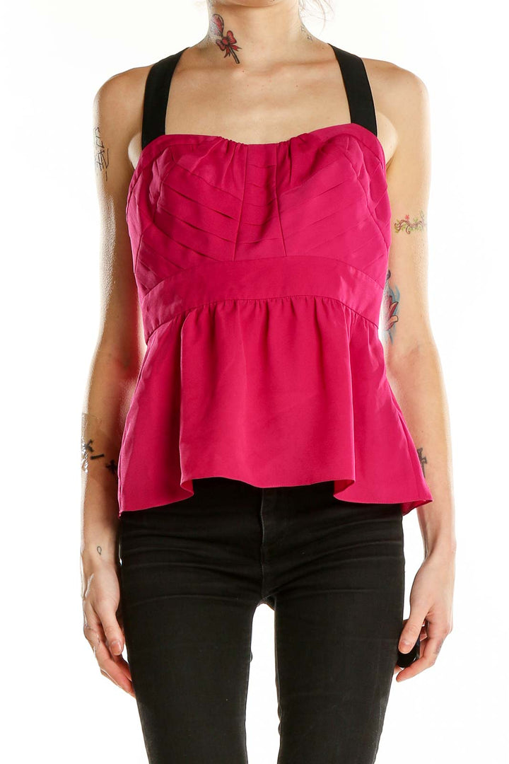 Front view of hot pink Parameter peplum top with sweetheart neckline and black straps