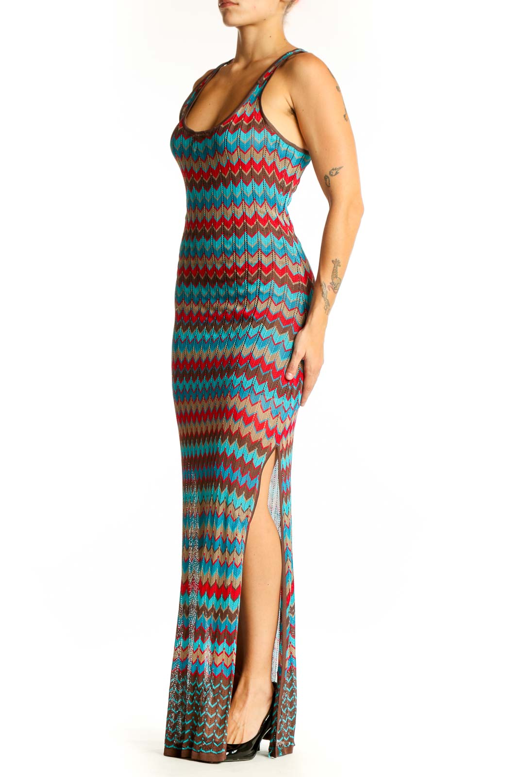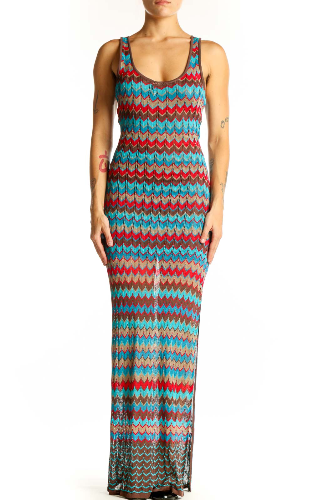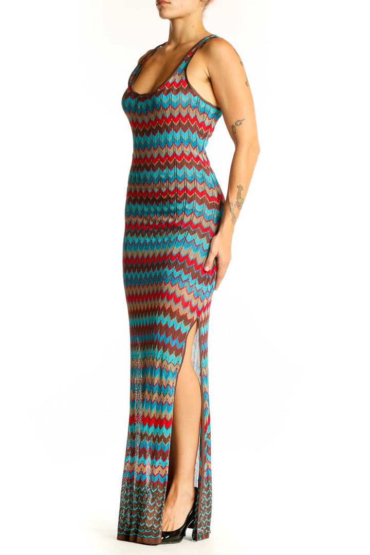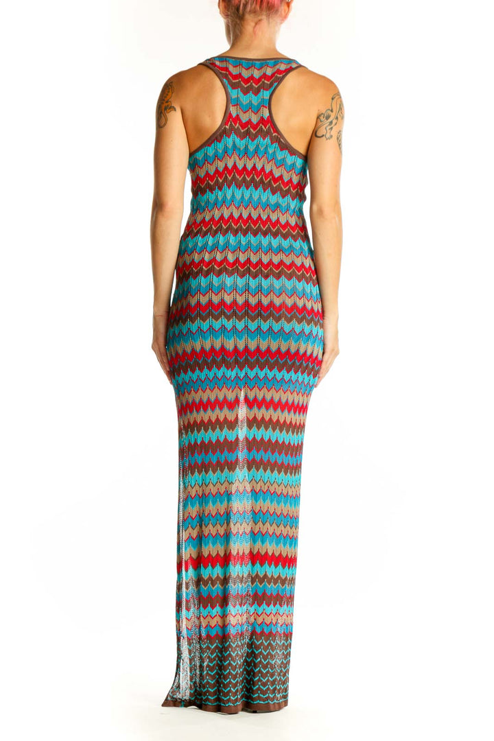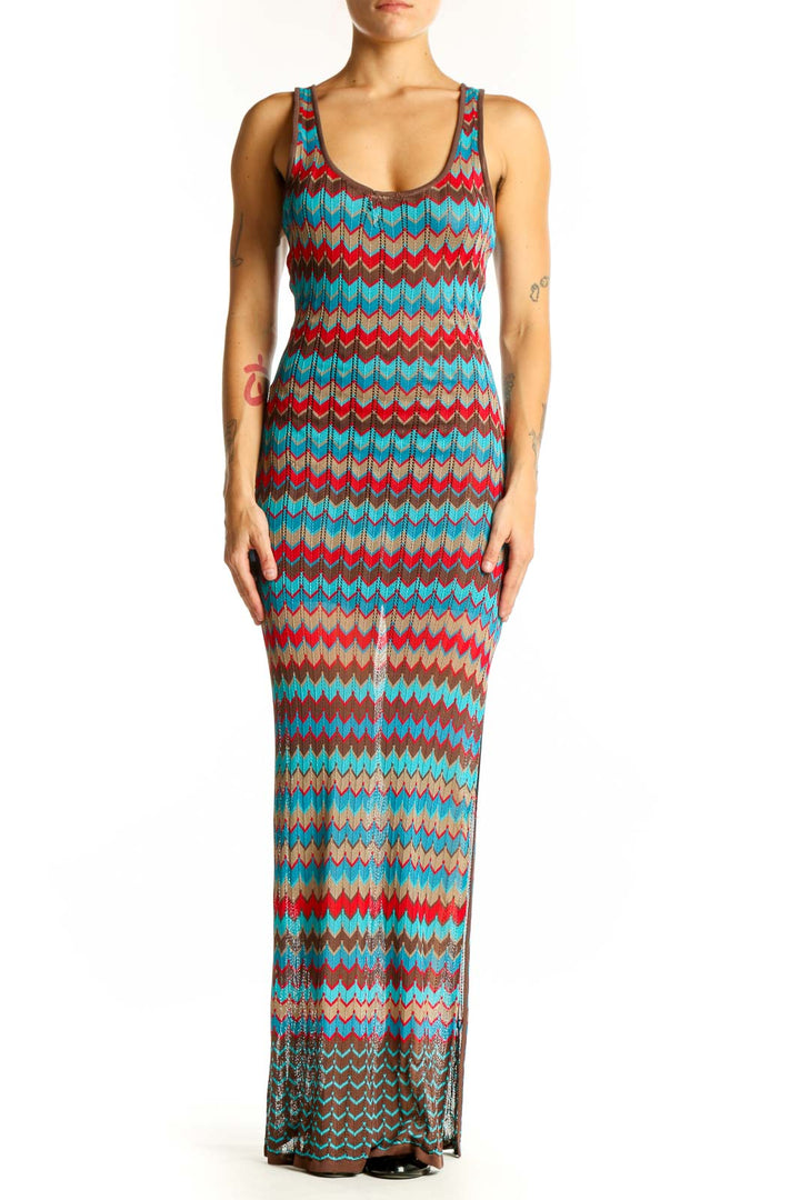 Make a striking statement in this vibrant Turquoise Chevron Knit Maxi Dress by Haute Hippie. The eye-catching chevron pattern in shades of turquoise, red, and brown creates a bold and stylish look that's perfect for any occasion. Crafted from a soft blend of polyester and rayon, this dress offers both comfort and durability.