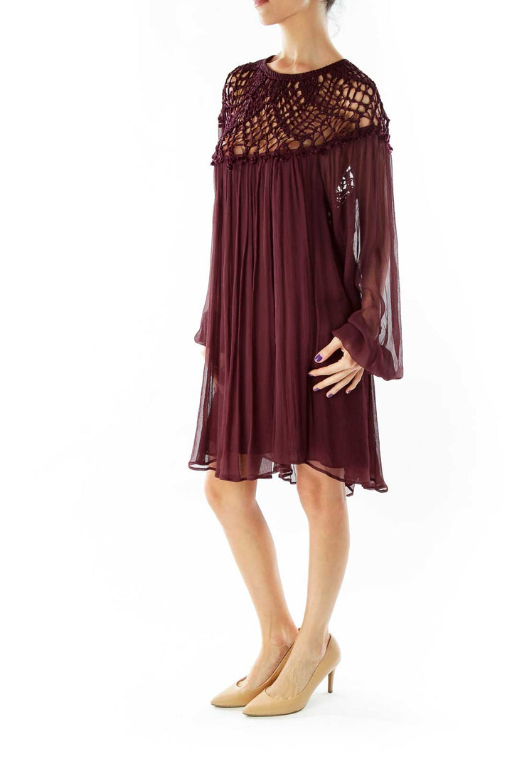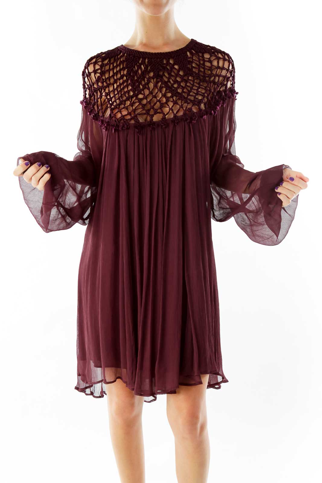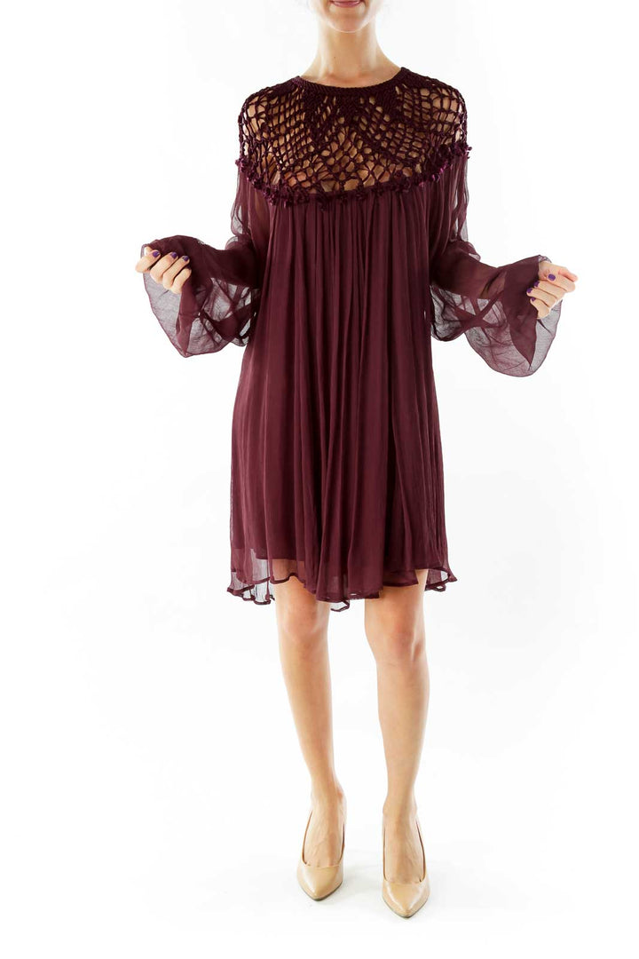 Elevate your style with this enchanting burgundy dress from Free People. The standout feature is the intricate crochet yoke that adorns the neckline and shoulders, creating a stunning contrast against the flowy, sheer fabric. Long bell sleeves add a touch of bohemian flair, while the gathered bodice ensures a flattering fit.