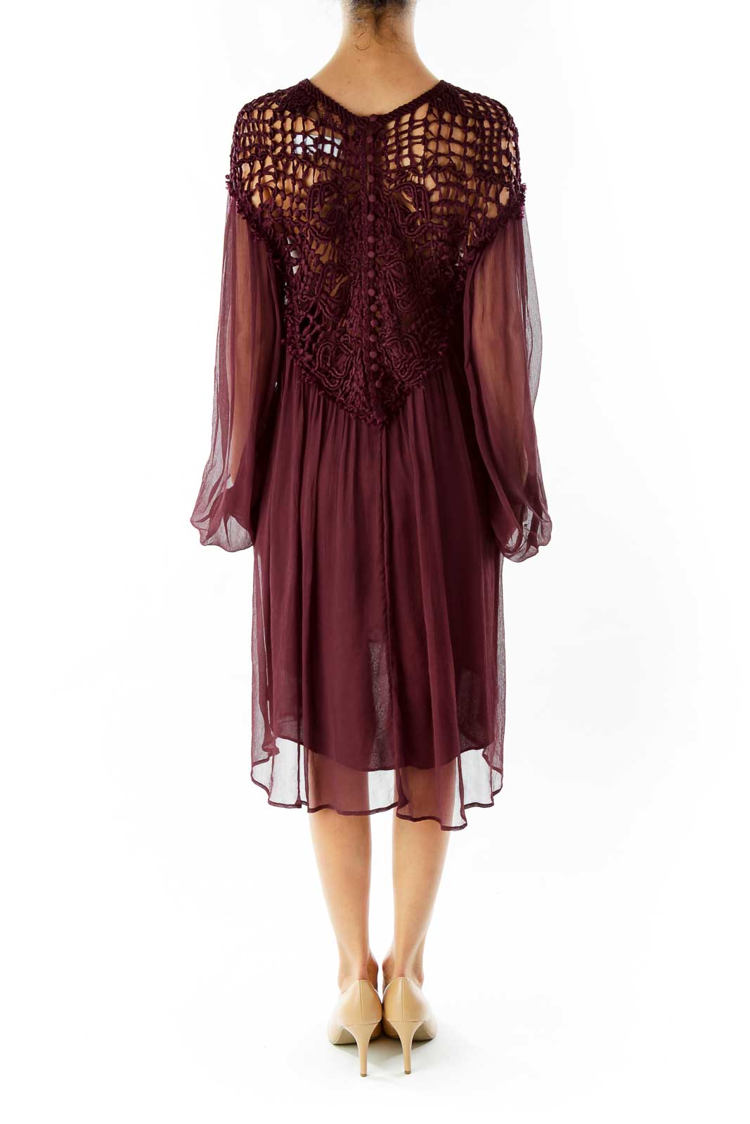 Crafted from a lightweight, semi-sheer material, this dress offers both comfort and elegance. The rich burgundy hue is perfect for various occasions, from casual outings to more formal events. The dress falls to a midi length, providing versatile styling options.