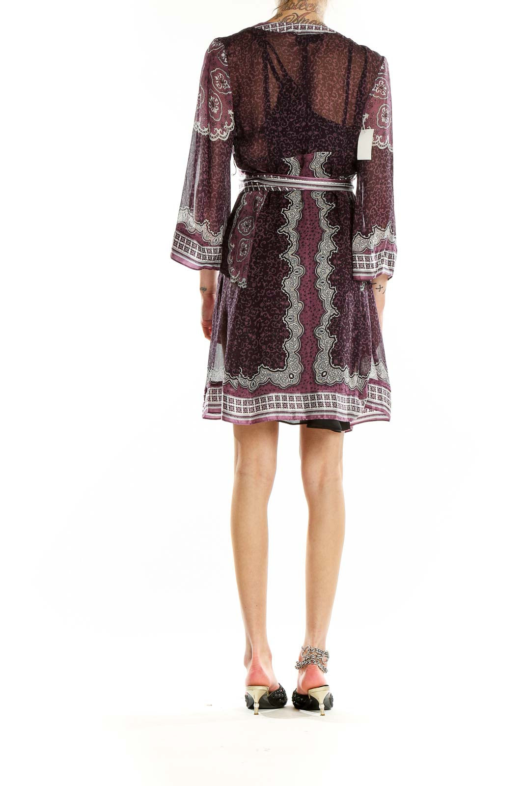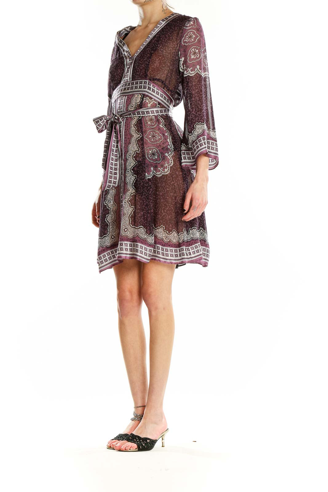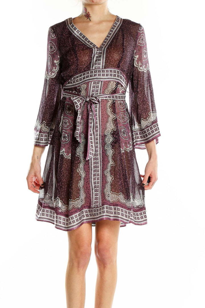 The eye-catching paisley print in shades of burgundy, white, and black is adorned with intricate geometric borders, adding a unique and stylish flair to the dress. The flowy bell sleeves provide a bohemian touch, perfect for both day and evening wear. The midi length offers versatility, making it suitable for various occasions.