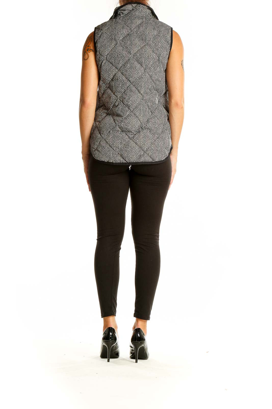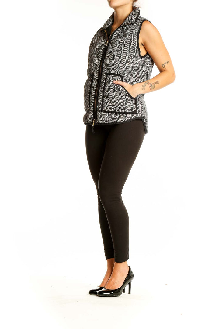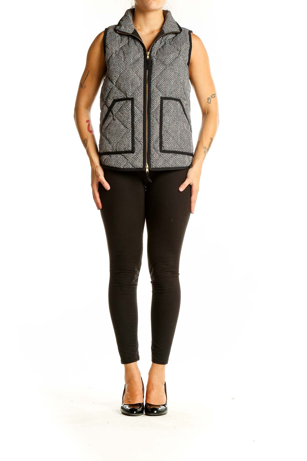 Stay stylishly warm with this J.Crew gray herringbone quilted puffer vest. Perfect for layering, this sleeveless jacket features a classic herringbone pattern in a sophisticated gray and black color scheme. The polyester and duvet blend offers excellent insulation without bulk, making it ideal for chilly days. Designed with practicality in mind, it boasts two front pockets with black trim for a striking contrast. The full-length zipper ensures easy wear, while the stand-up collar adds extra protection against the elements. In excellent condition, this versatile vest is a must-have addition to any casual or smart-casual wardrobe.