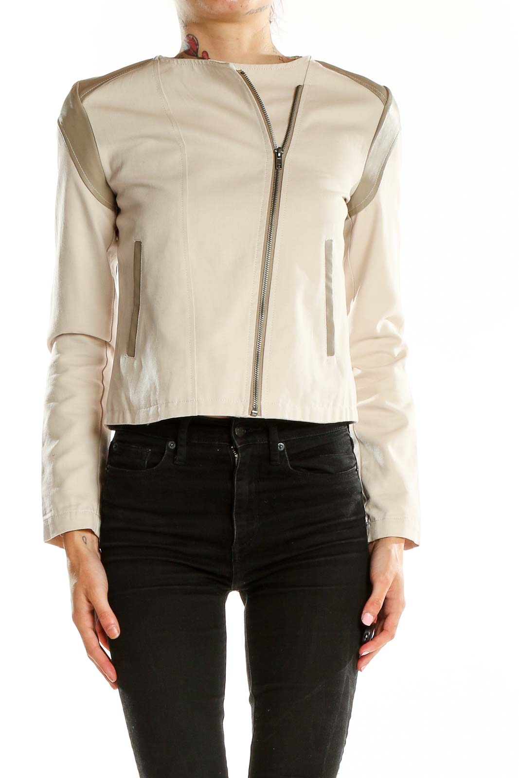 Elevate your style with this chic beige cropped jacket from Jack. Featuring an innovative asymmetric zip design, this jacket combines modern aesthetics with practical functionality. The unique shoulder and elbow patches in a contrasting taupe shade add a touch of edgy sophistication to the overall look.