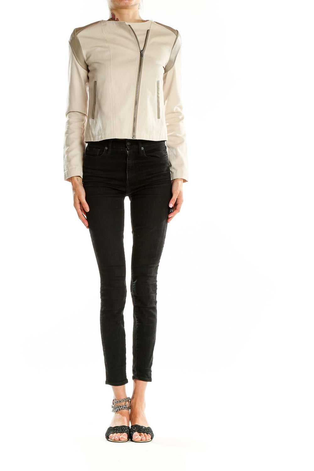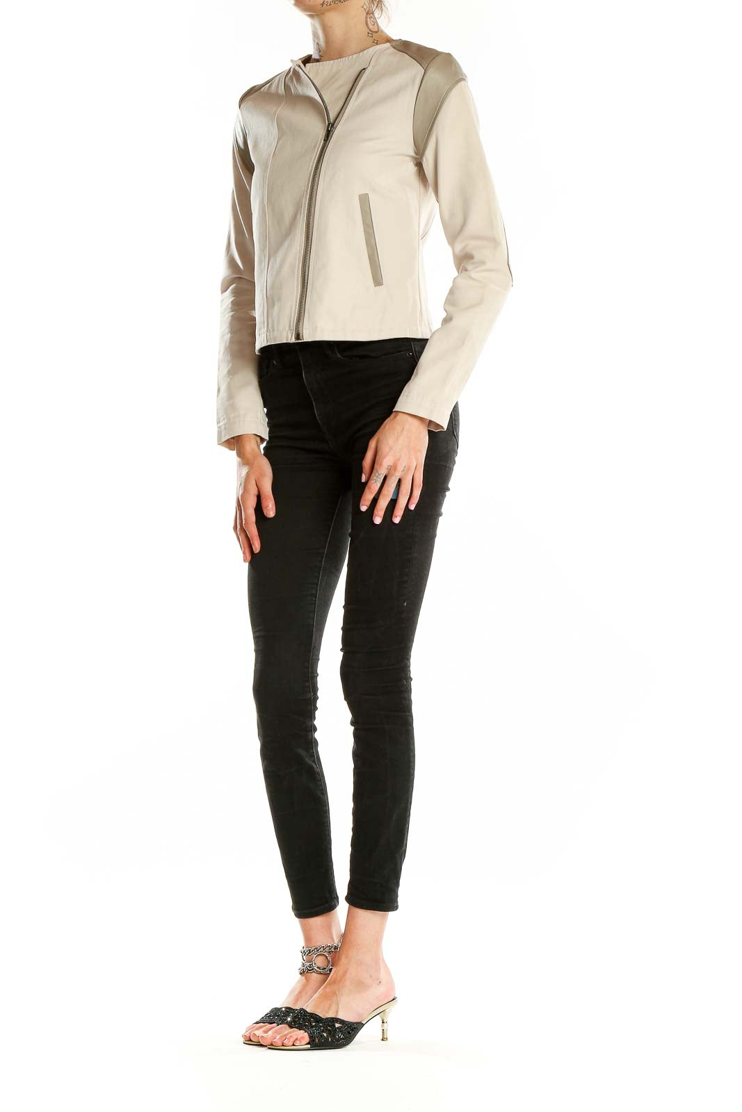 The jacket's clean lines and minimalist design make it versatile enough for various occasions, from casual outings to more polished ensembles. Its neutral beige color allows for easy coordination with a wide range of outfits. The thoughtful design includes convenient side pockets, adding both style and practicality to this must-have piece.