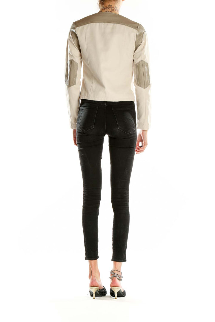 Back view of beige Jack cropped jacket showing contrasting shoulder patches