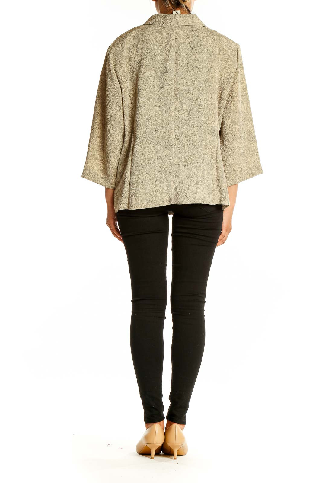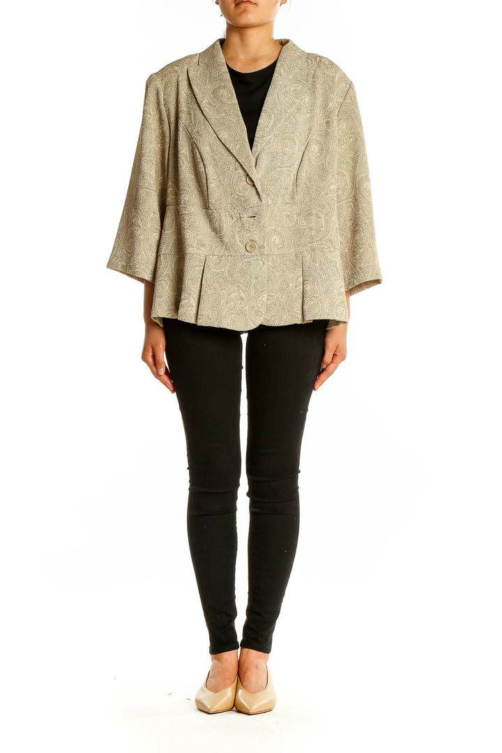 Elevate your wardrobe with this sophisticated beige paisley print peplum jacket by Courtenay. Crafted from soft polyester, this elegant piece features a subtle yet intricate paisley pattern that adds a touch of refinement to any outfit. The jacket's peplum silhouette creates a flattering waistline, while the three-quarter length sleeves offer versatility for various seasons.