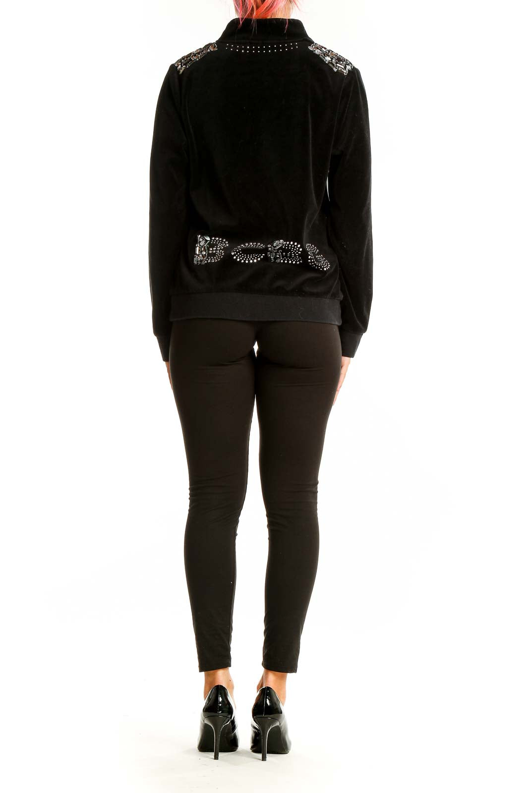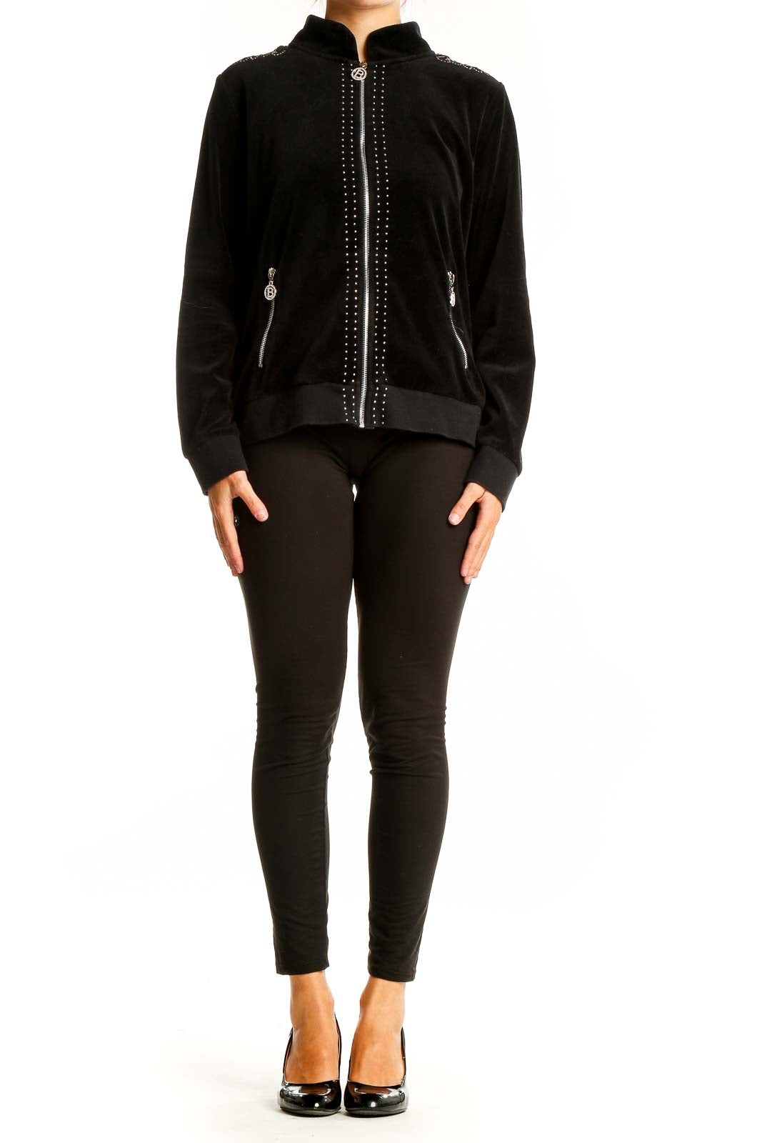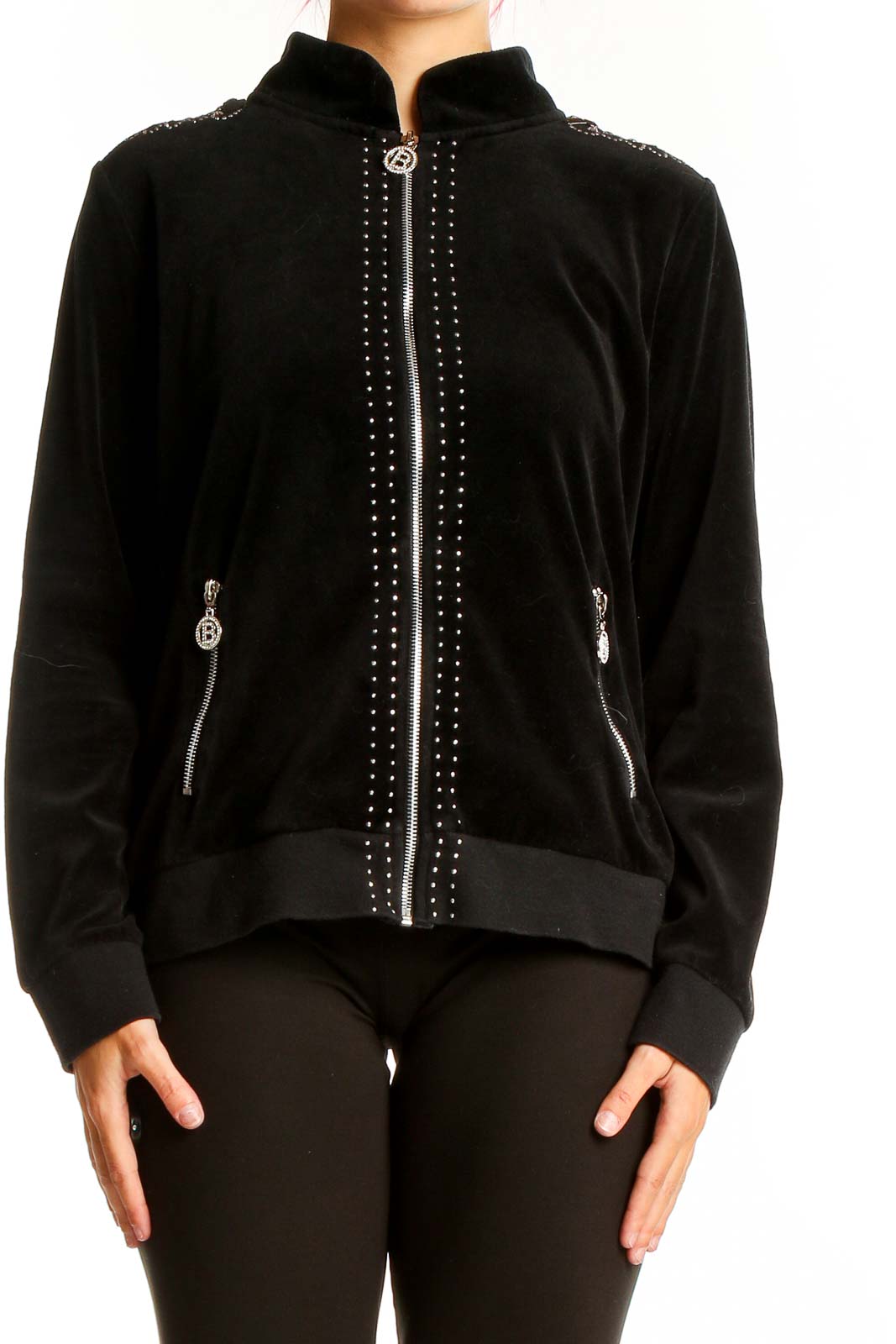 Make a statement with this chic black velvet bomber jacket from BCBGeneration. The luxurious velvet fabric adds a touch of elegance, while the studded detailing along the collar, front zipper, and back creates an edgy, rock-inspired look. The silver-toned hardware, including the front zipper and pocket zippers, provides a sleek contrast against the rich black velvet.