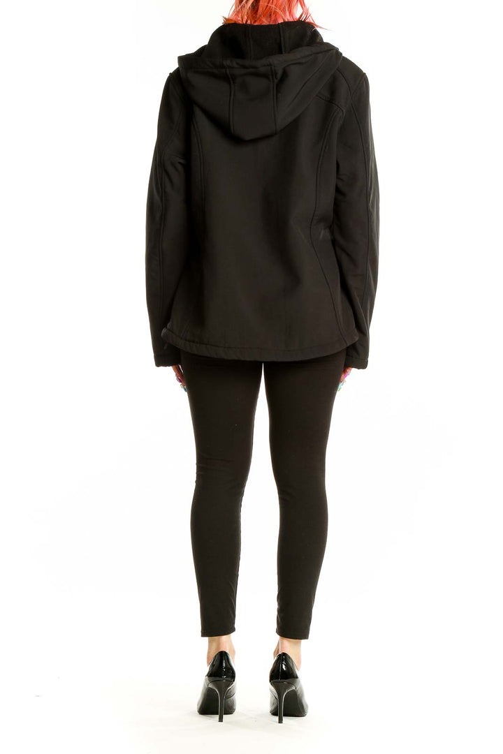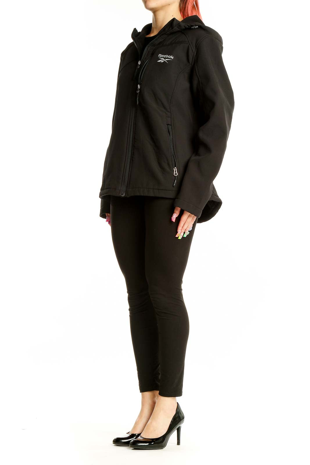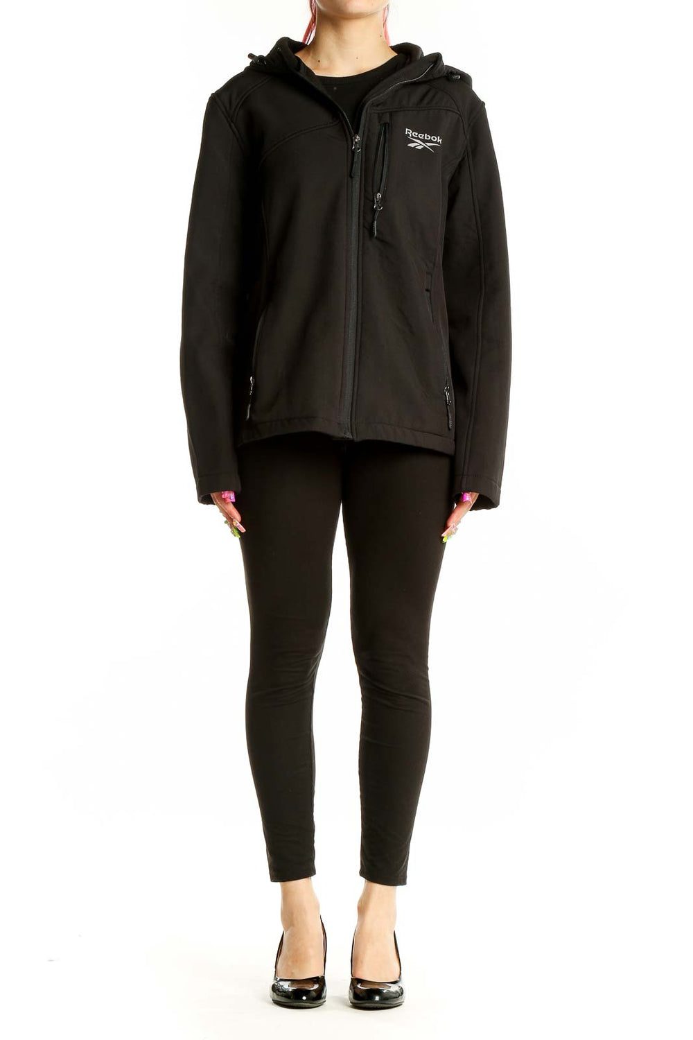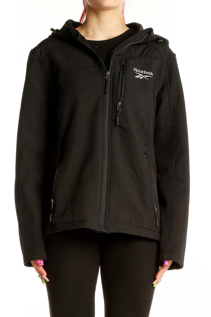 Elevate your workout wardrobe with this sleek black performance jacket from Reebok. Crafted from a high-quality blend of polyester and spandex, this jacket offers both comfort and flexibility for all your athletic endeavors. The full-zip front and adjustable hood provide versatility, allowing you to customize your coverage based on the weather or your activity level.