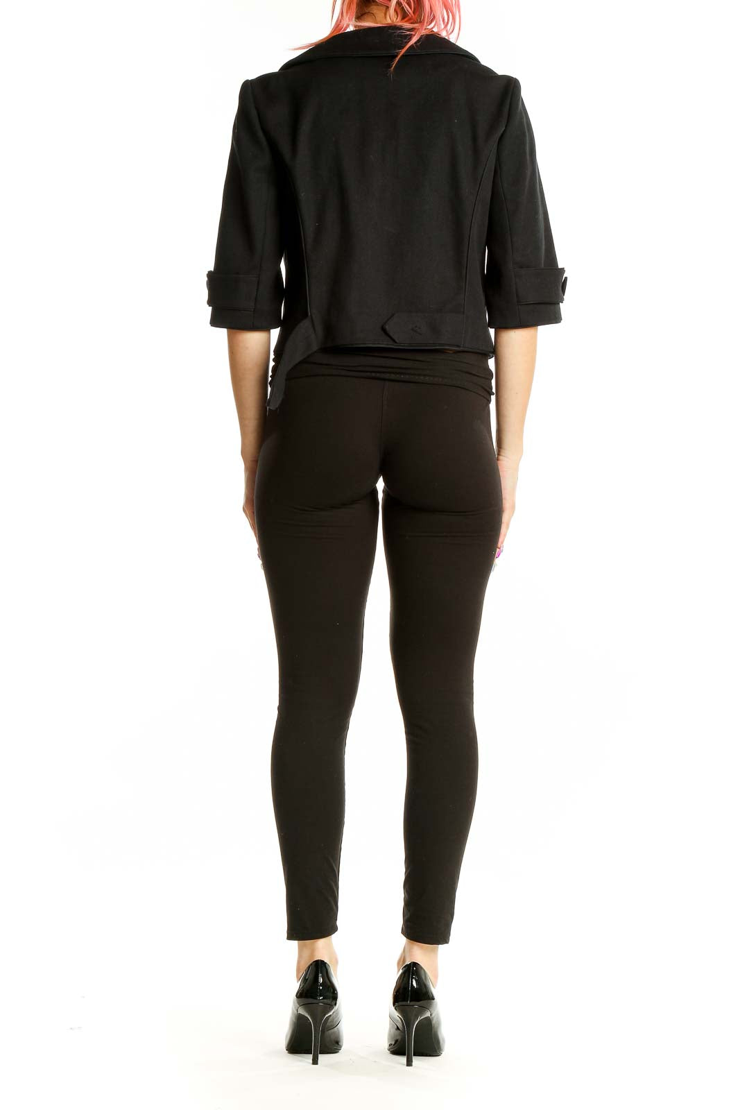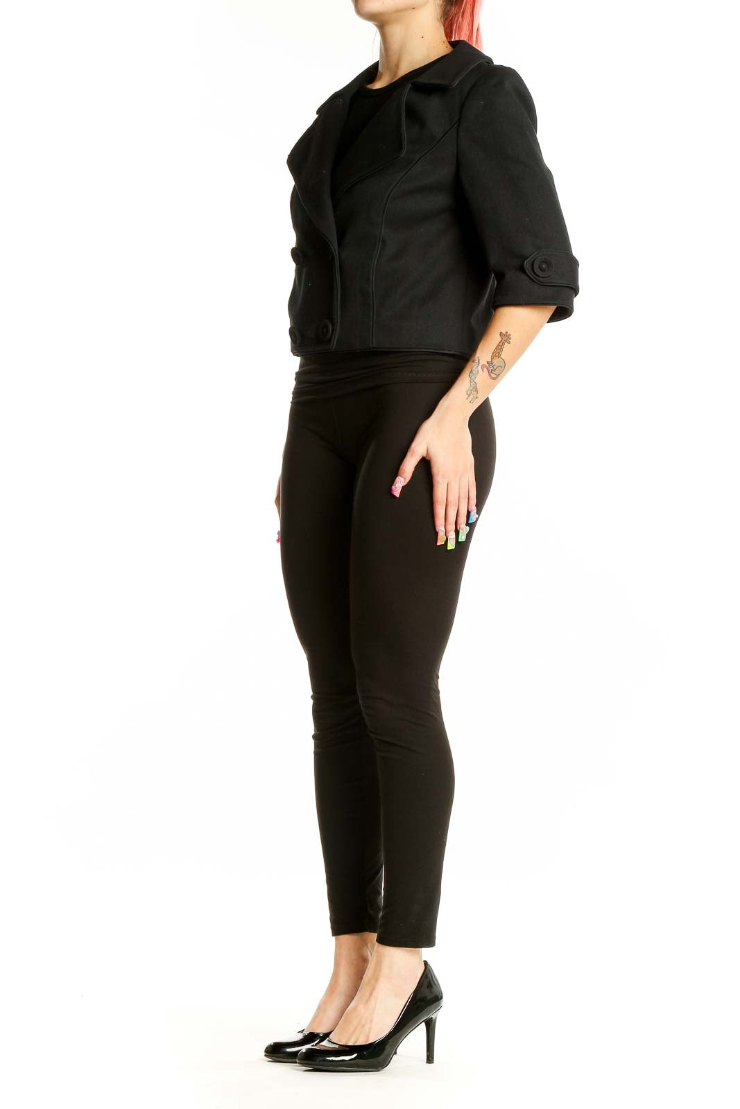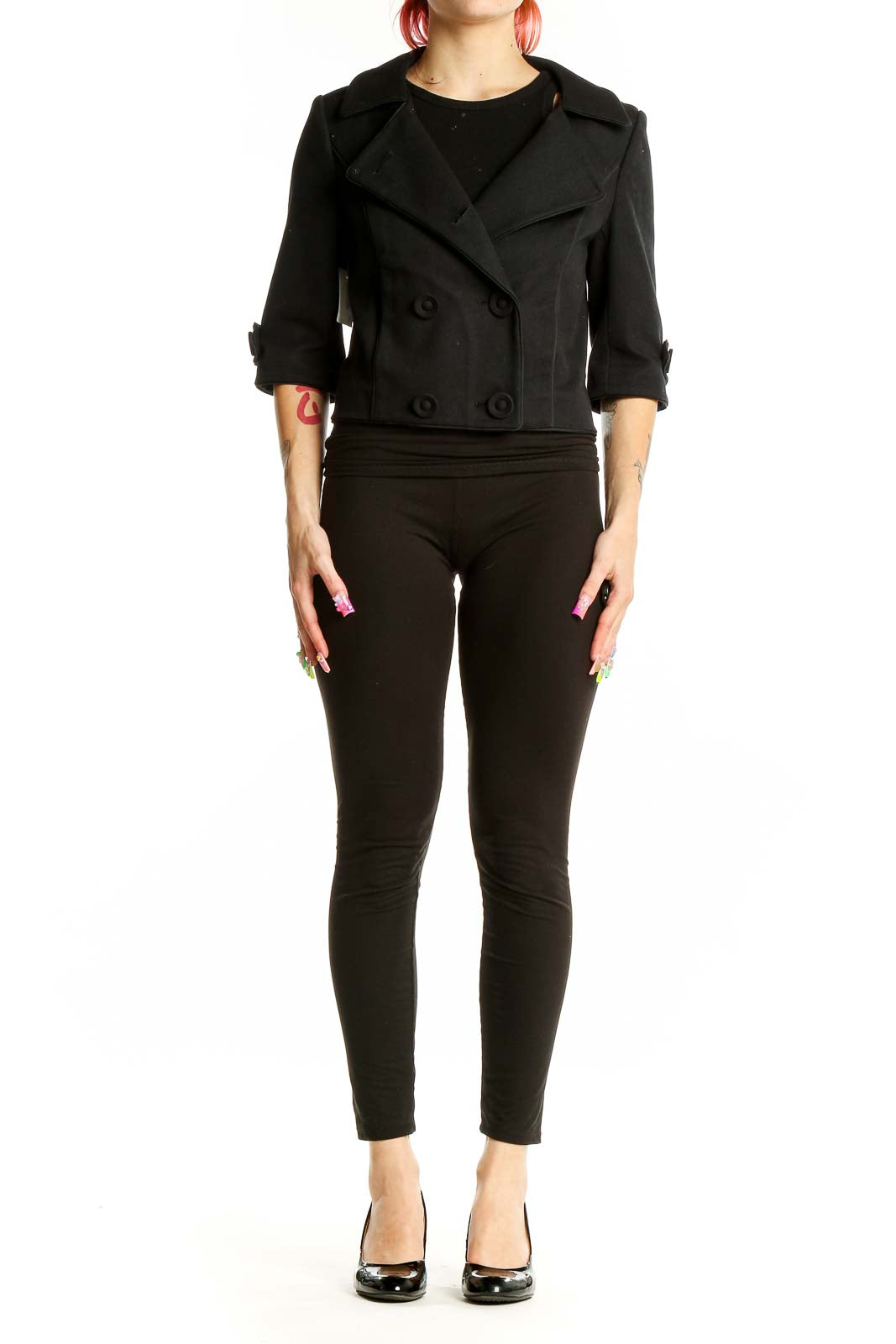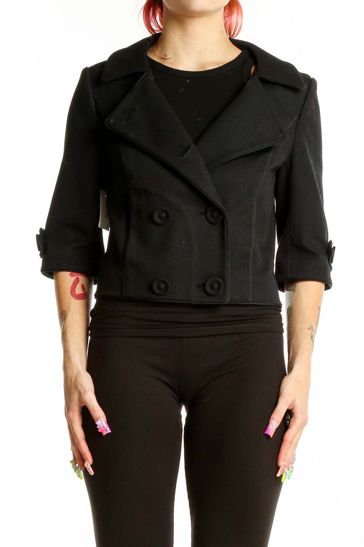 Make a bold statement with this chic black cropped jacket from Vera Wang Lavender Label. Crafted from a luxurious blend of cotton and polyester, this jacket offers both comfort and style. The double-breasted design with its prominent buttons adds a touch of sophistication, while the cropped length creates a modern, trendy silhouette. Perfect for layering over dresses or pairing with high-waisted pants, this versatile piece is a must-have for any fashion-forward wardrobe. The 3/4 length sleeves with cuff details add an extra element of elegance. In excellent condition, this medium-sized jacket is sure to become your go-to outerwear for both casual and semi-formal occasions.